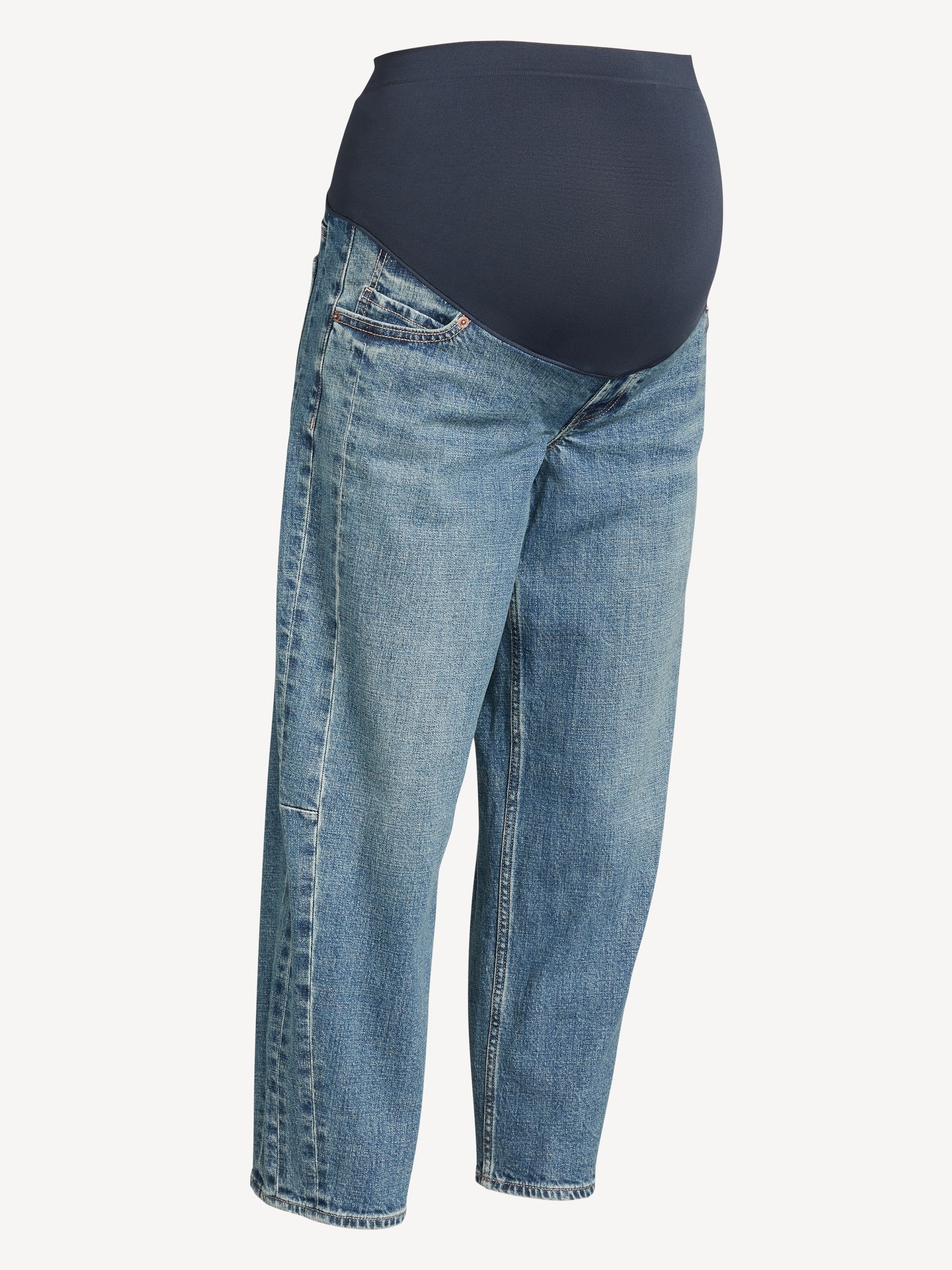 Maternity Full Panel Barrel Jeans: The effortless curved shape that’s so hot right now.full panel waistband, faux fly, barrel leg, scoop pockets, back patch pockets, #826440