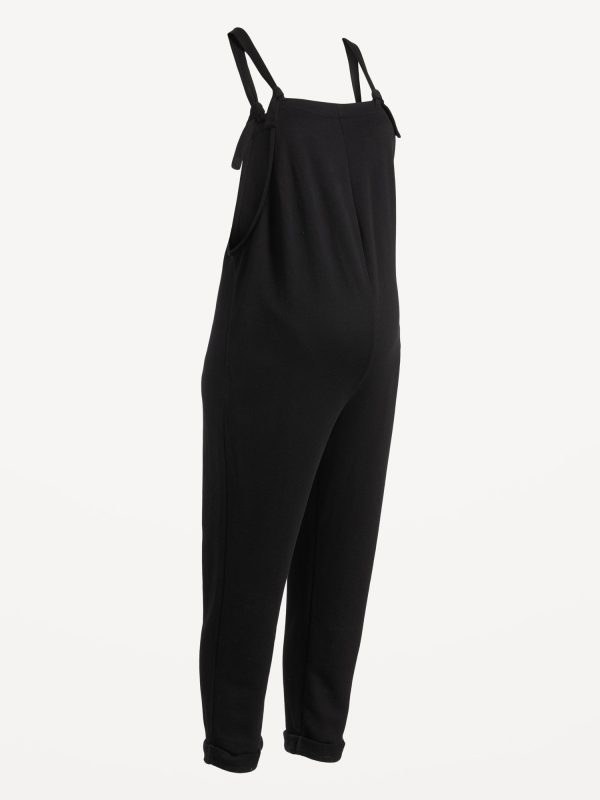 Maternity Knotted-Strap Fleece Overalls: perfect for baby shower, square neck, knotted shoulder straps, on-seam pockets, rolled cuffs, #758300