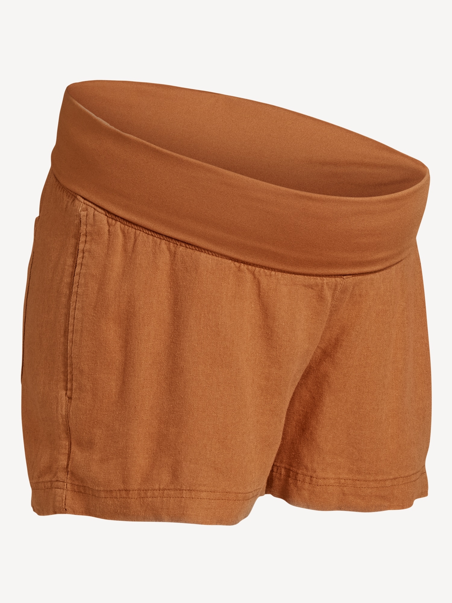 Maternity Linen-Blend Pull-On Shorts — 3.5-inch inseam: foldover jersey waistband, on-seam side pockets, back patch pockets, easy pull-on style, #746574