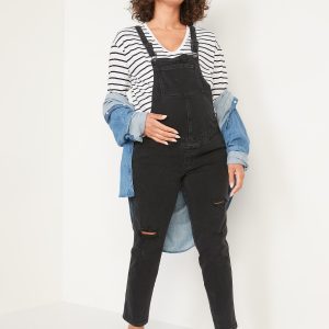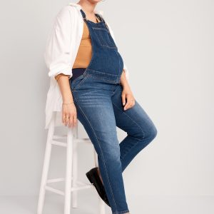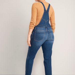 Maternity Side-Panel OG Straight Jean Overalls: Our OG Straight Jean Overalls? Think “mom jeans”…if your mom was a supermodel. Part ‘90s nostalgia, part new-normal comfort, served straight up 😎, Adjustable shoulder straps and metal button fastenings; Patch pocket at bib yoke., Banded waist, with built-in belt loops and discreet elastic side panels at the hips., Faux fly, with fading and whiskering to create a vintage, lived-in look., Soft, durable medium-wash cotton denim, with comfortable stretch., Never-Quit Shape Retention holds its shape and hugs in all the right places, wear after wear., These overalls are made with 5% recycled cotton. Less waste in the world 🌎, #759165