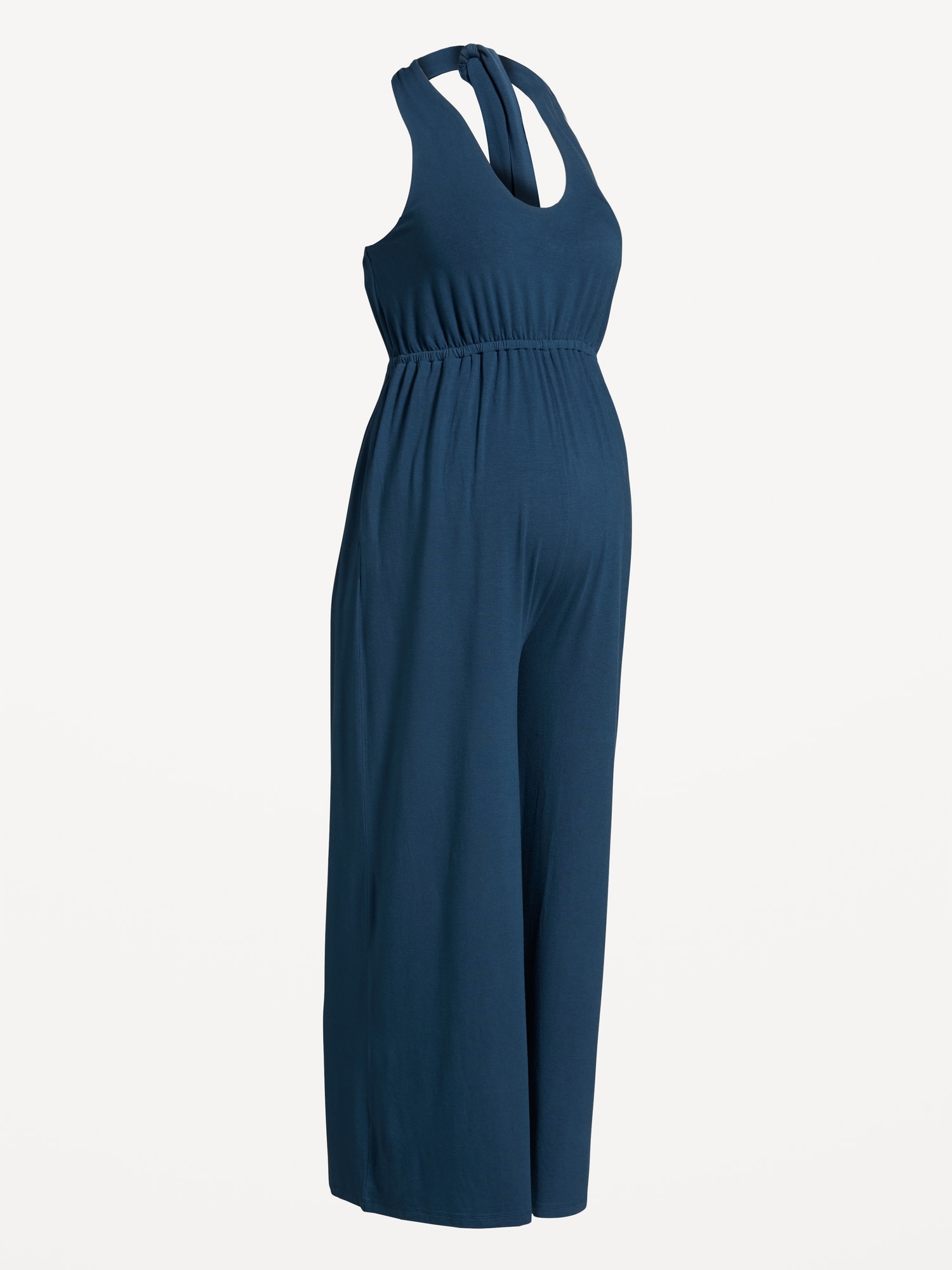 Maternity Waist-Defined Halter Jumpsuit: perfect for baby shower, tie-back halter neck, sleeveless, elastic waistband, on-seam pockets, wide leg, #719575