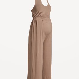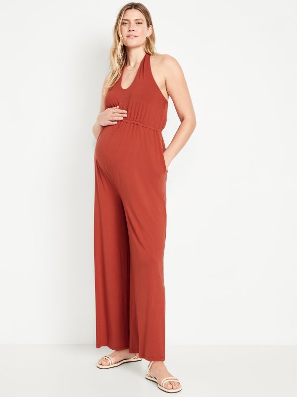 Maternity Waist-Defined Halter Jumpsuit: perfect for baby shower, tie-back halter neck, sleeveless, elastic waistband, on-seam pockets, wide leg, #719575