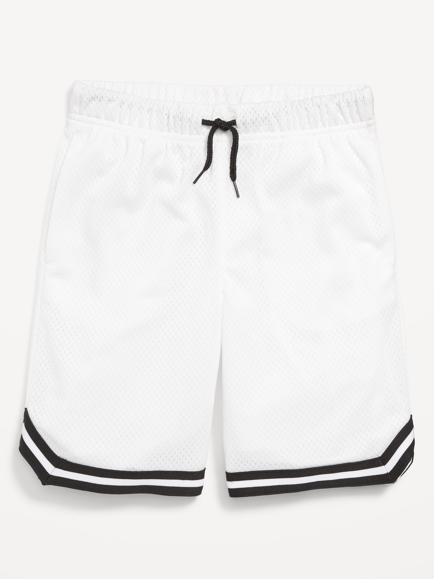Mesh Basketball Shorts for Boys (At Knee): Made to keep up with all their shenanigans., Elasticized waistband, with adjustable drawstring., On-seam welt pockets., Retro striped tape trim at leg openings and vented sides., Breathable lightweight mesh lets him vent., Smooth, lightweight tricot lining., #875637