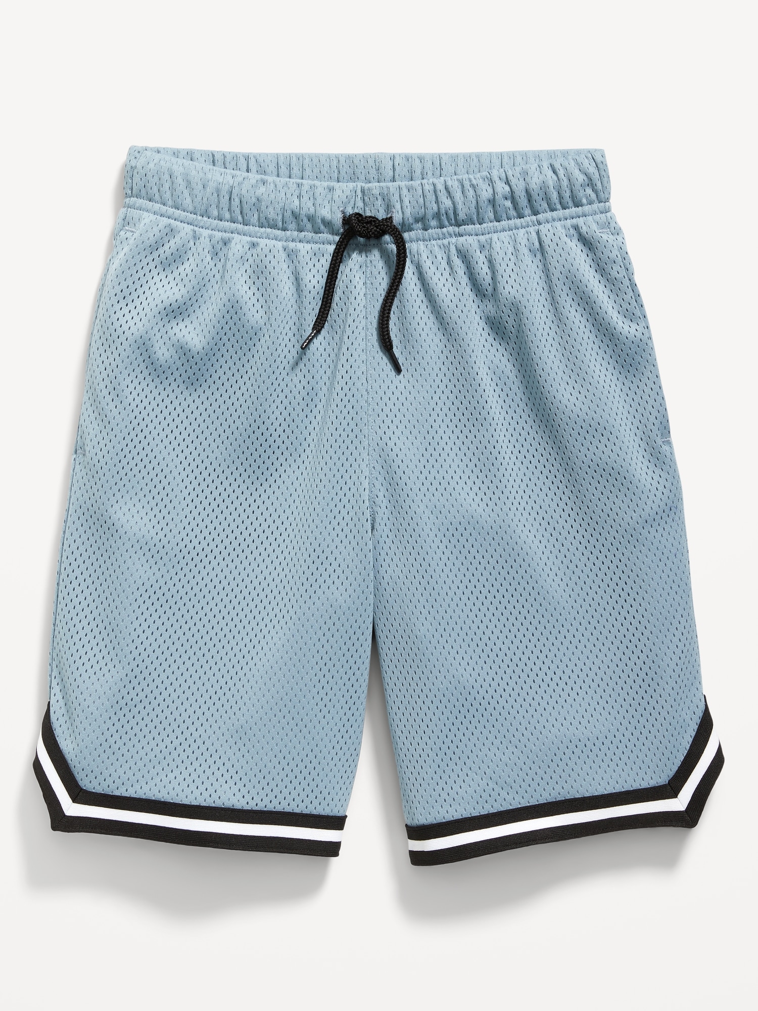 Mesh Basketball Shorts for Boys (At Knee): Made to keep up with all their shenanigans., Elasticized waistband, with adjustable drawstring., On-seam welt pockets., Retro striped tape trim at leg openings and vented sides., Breathable lightweight mesh lets him vent., Smooth, lightweight tricot lining., #875637