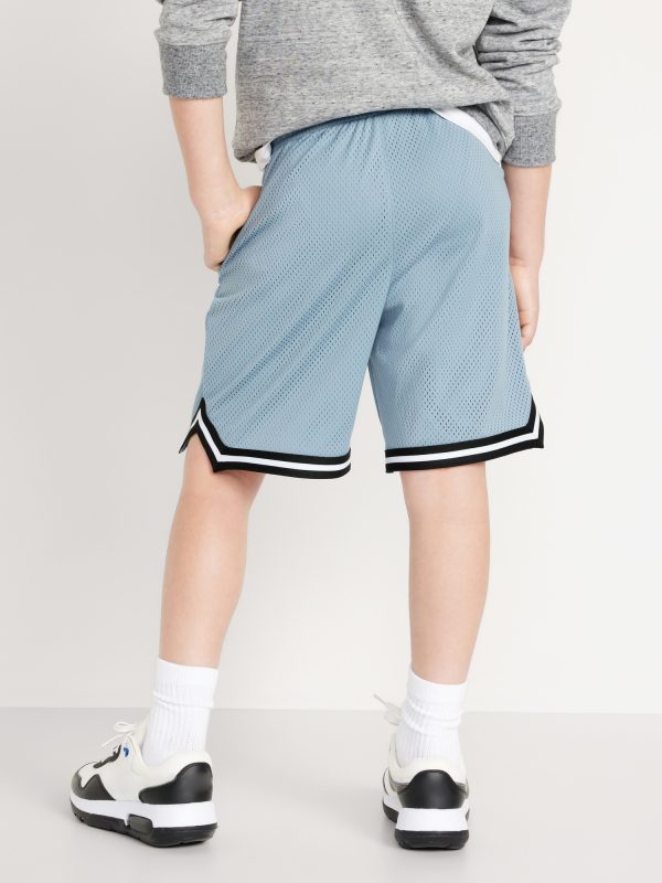 Mesh Basketball Shorts for Boys (At Knee): Made to keep up with all their shenanigans., Elasticized waistband, with adjustable drawstring., On-seam welt pockets., Retro striped tape trim at leg openings and vented sides., Breathable lightweight mesh lets him vent., Smooth, lightweight tricot lining., #875637