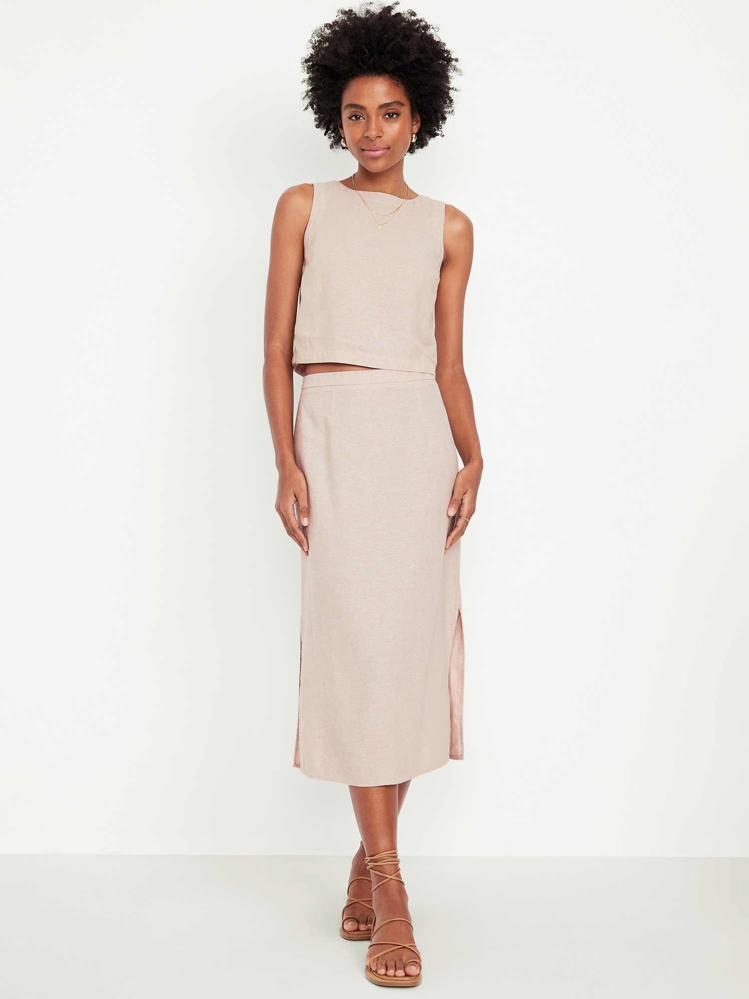 Mid-Rise Linen-Blend Midi Skirt: elasticized back waist, hidden left side zipper, side slits, easy pull-on style, #705483