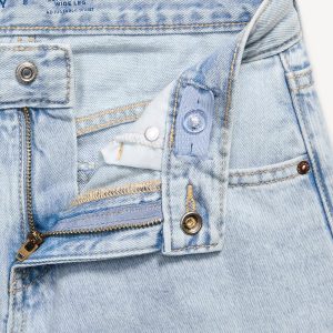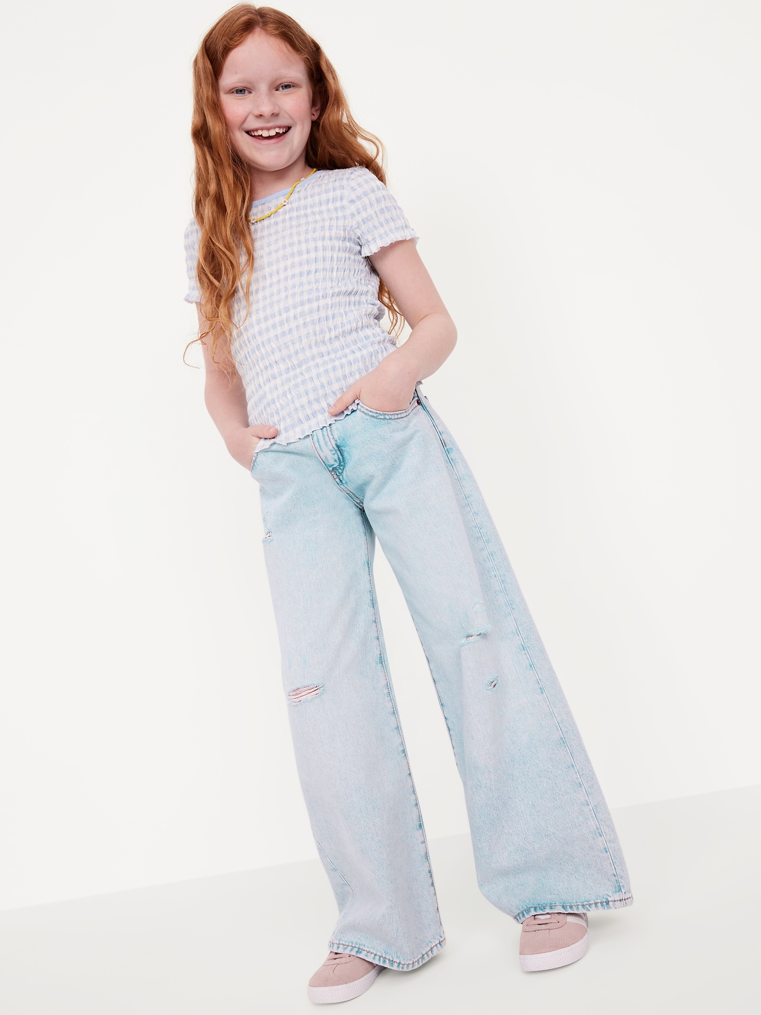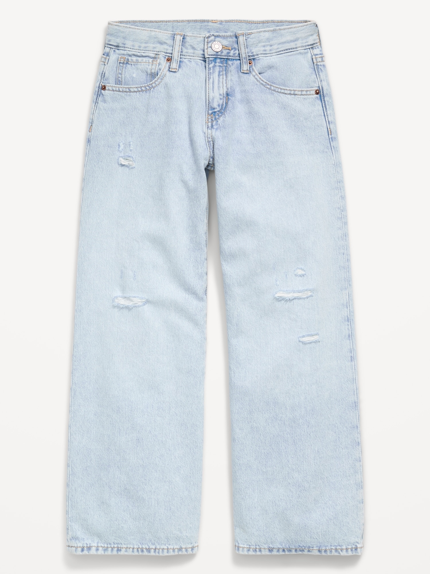 Mid-Rise Super Baggy Wide-Leg Jeans for Girls: mid rise, interior adjustable waistband, crossover waist, snap button closures (sizes 5-8), regular button closures (sizes 10-20), zip fly, scoop pockets and coin pocket, patch pockets at back, wide leg, embroidered stars, #803761