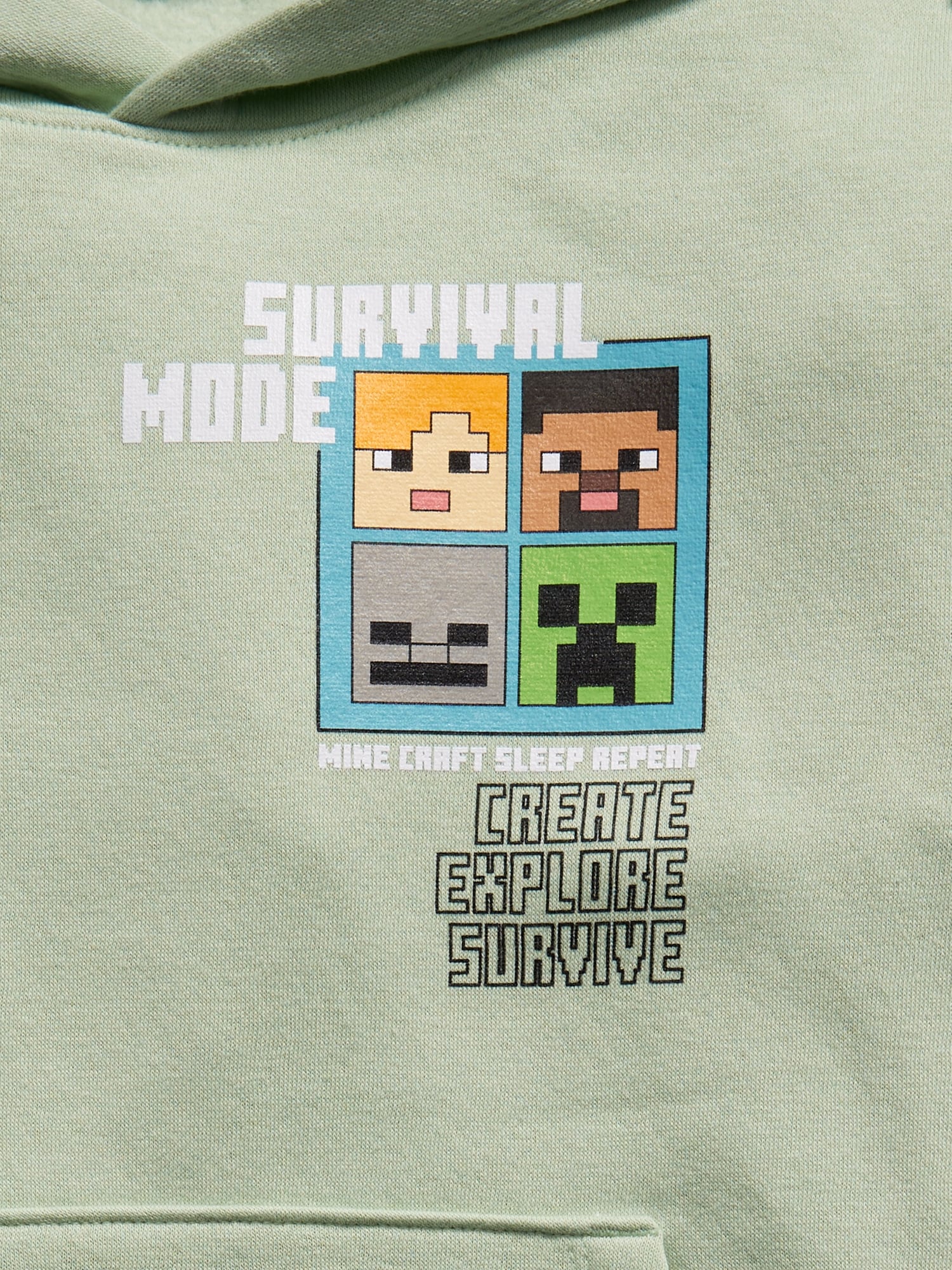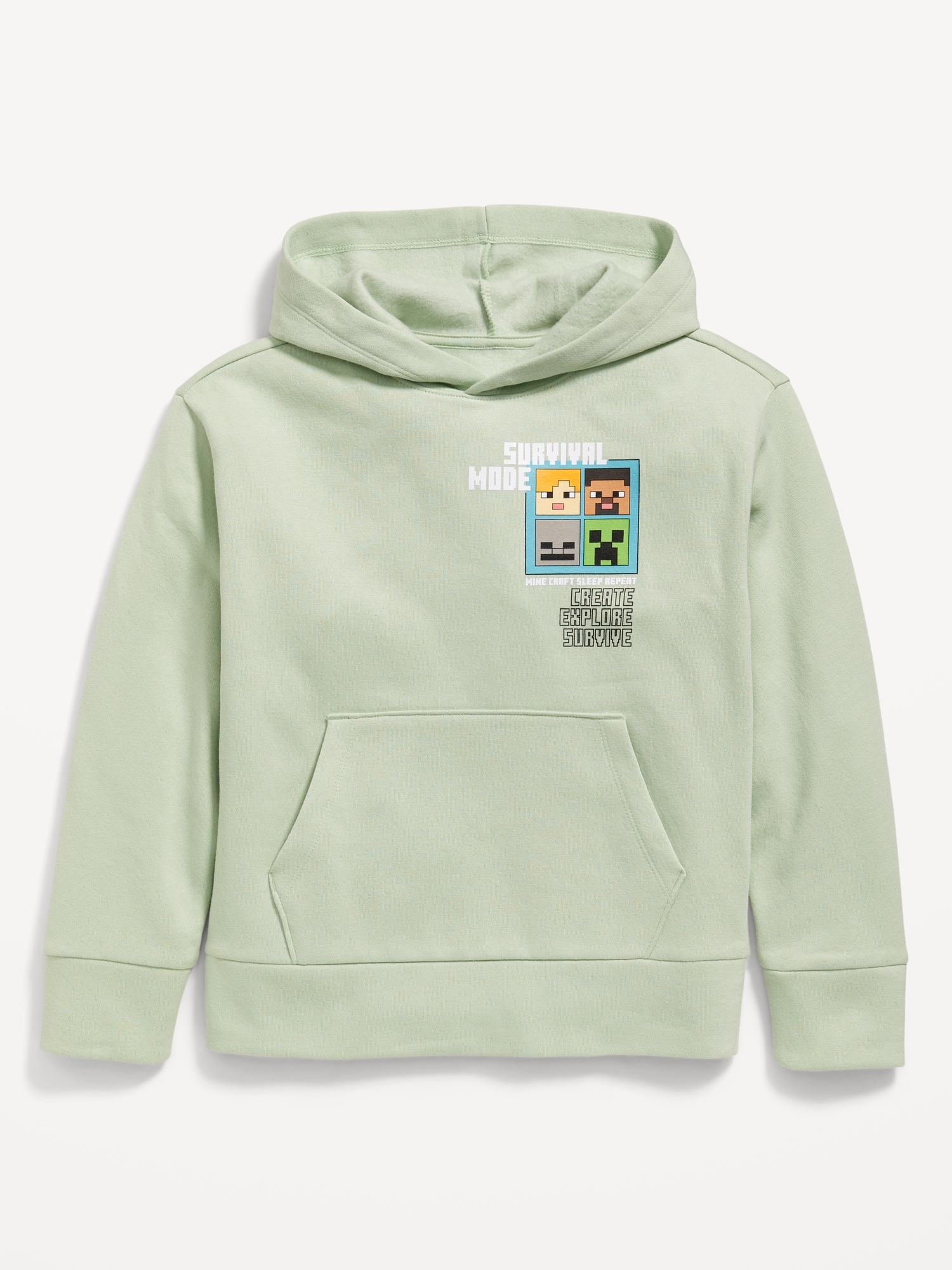Minecraft™ Gender-Neutral Graphic Pullover Hoodie for Kids: built-in hood, long sleeves, small-scale licensed graphic at front, large-scale licensed graphic, hand-warming pockets, banded hem, ©2025 Mojang AB. All Rights Reserved. Minecraft, the Minecraft logo and the Mojang Studios logo are trademarks of the Microsoft group of companies., #761741