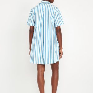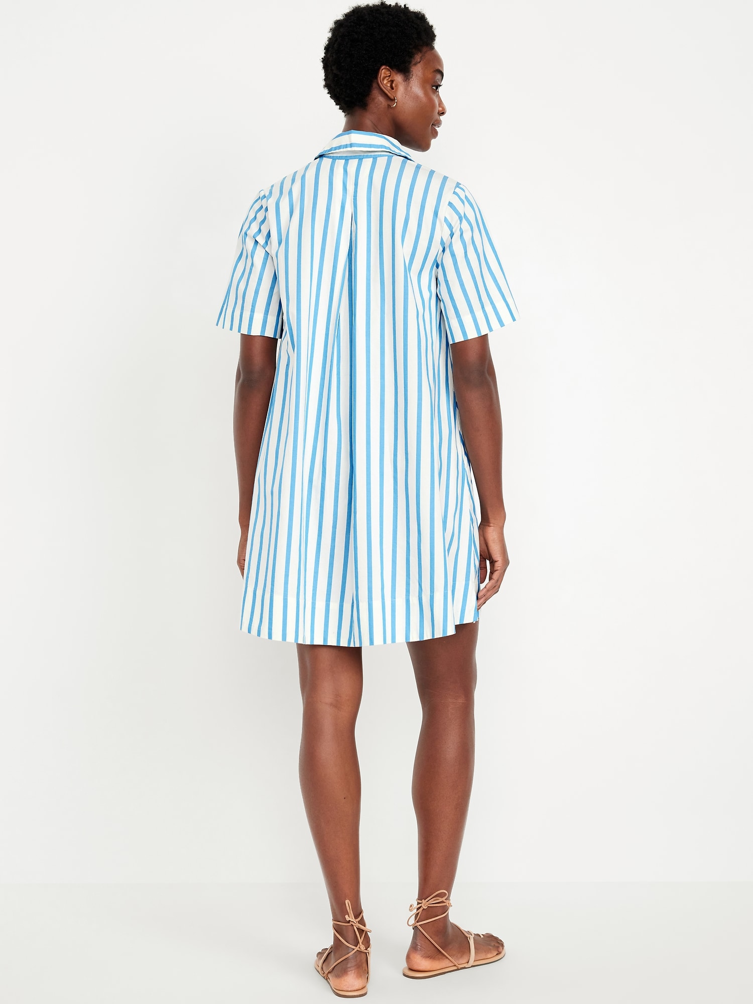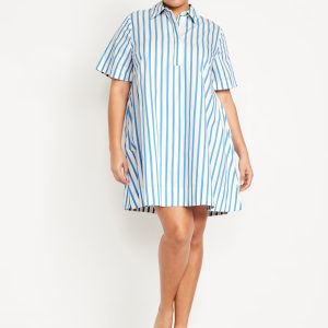 Mini Swing Shirt Dress: spread collar, elbow-length sleeves, covered button placket, vertical striped print, vented sides, #705705