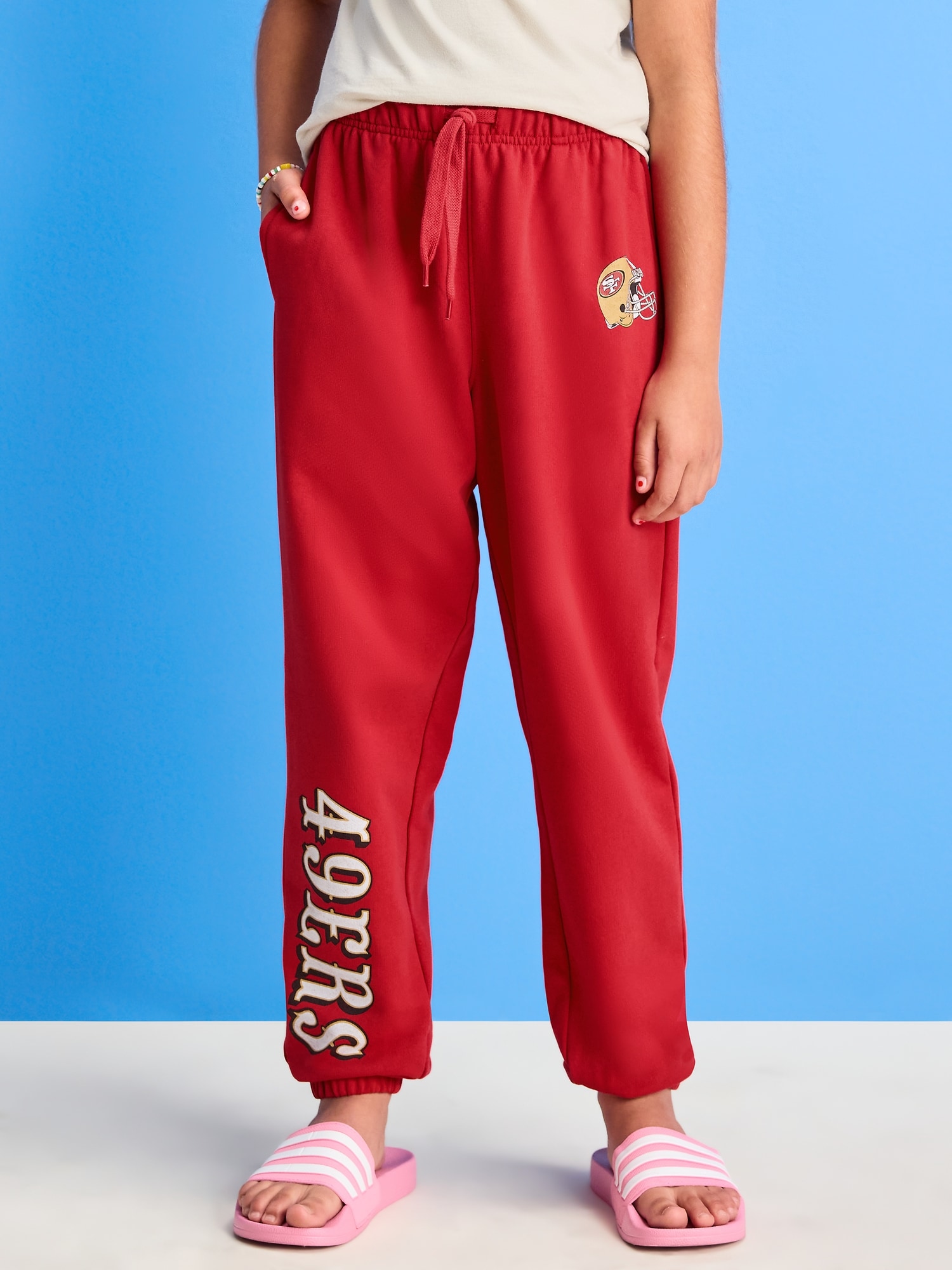 NFL™ San Francisco 49ers™ Gender-Neutral Jogger Sweatpants for Kids: elasticized waistband, functional drawstring, on-seam pockets, licensed graphics, © 2025 NFL Enterprises LLC. NFL and the NFL shield design are registered trademarks of the National Football League., #805561