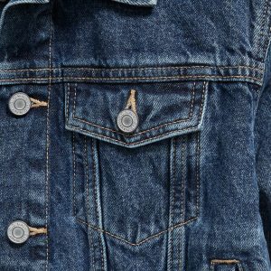 Non-Stretch Jean Trucker Jacket for Boys: spread collar, long sleeves, buttoned cuffs, button-flap pockets at chest, full-length buttoned placket, vertical welt pockets, #800739