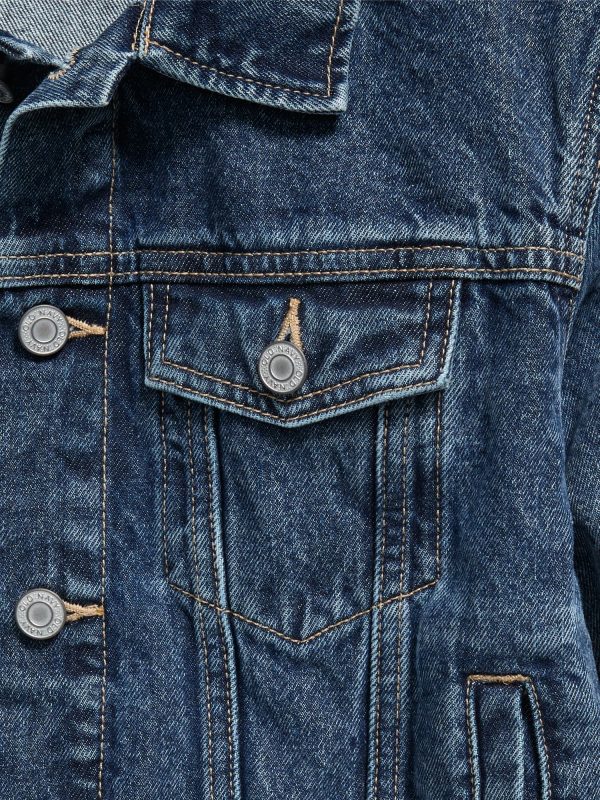 Non-Stretch Jean Trucker Jacket for Boys: spread collar, long sleeves, buttoned cuffs, button-flap pockets at chest, full-length buttoned placket, vertical welt pockets, #800739