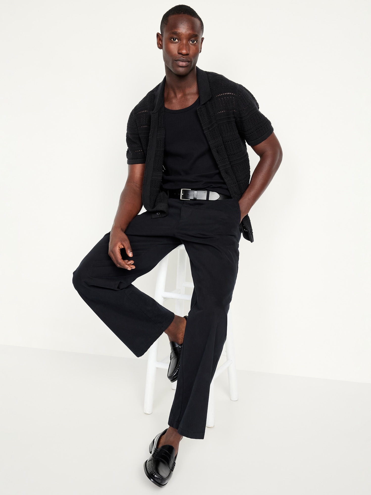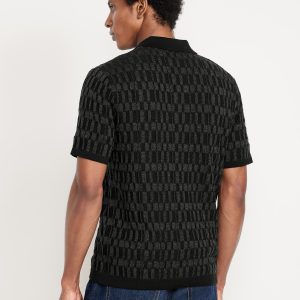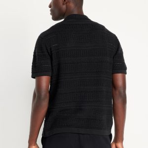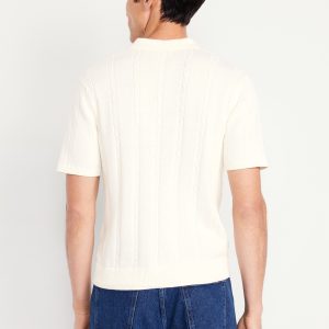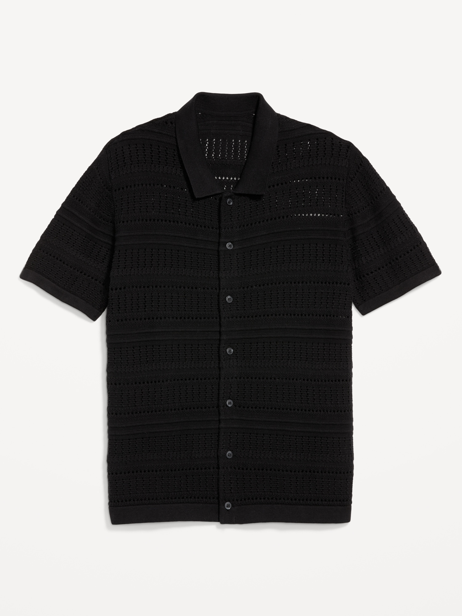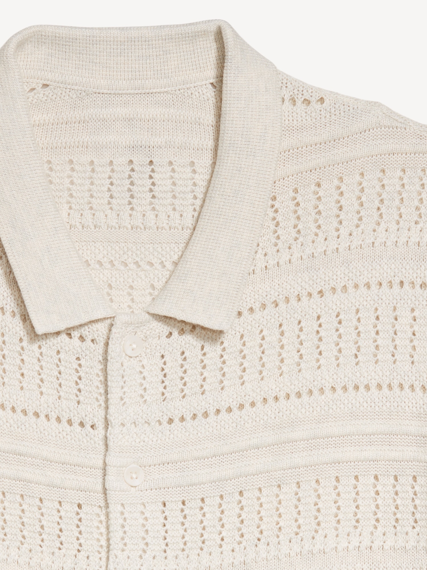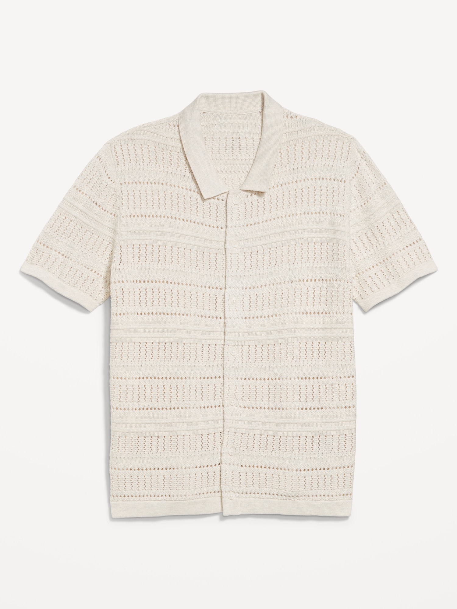 Open-Stitch Sweater: spread collar, short sleeves, full-button front, textured patterns vary, #762317