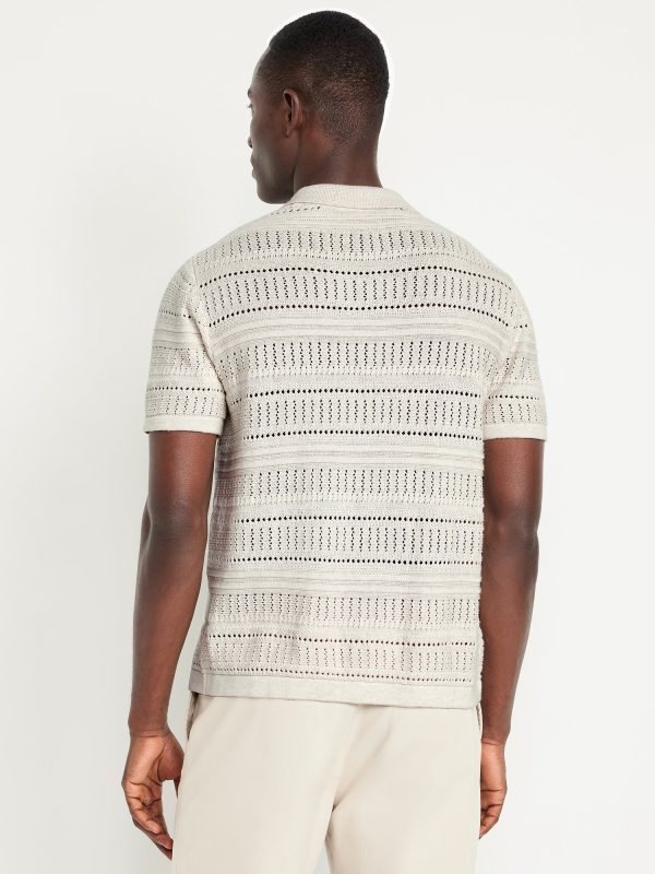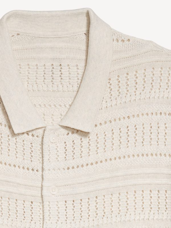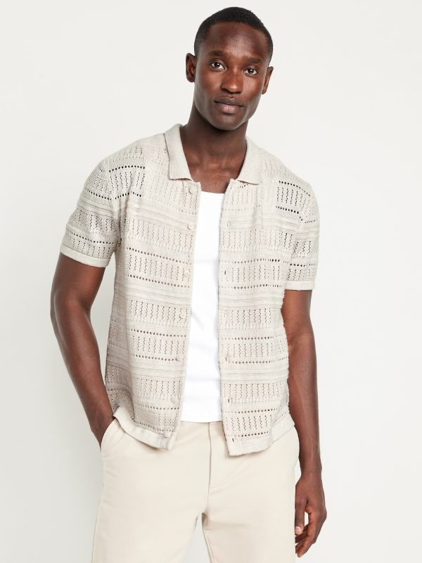 Open-Stitch Sweater: spread collar, short sleeves, full-button front, textured patterns vary, #762317