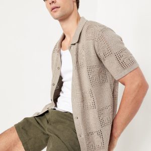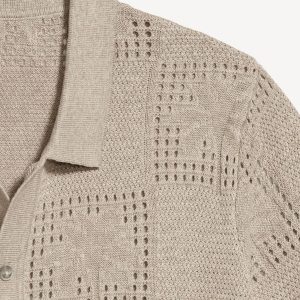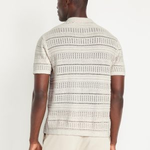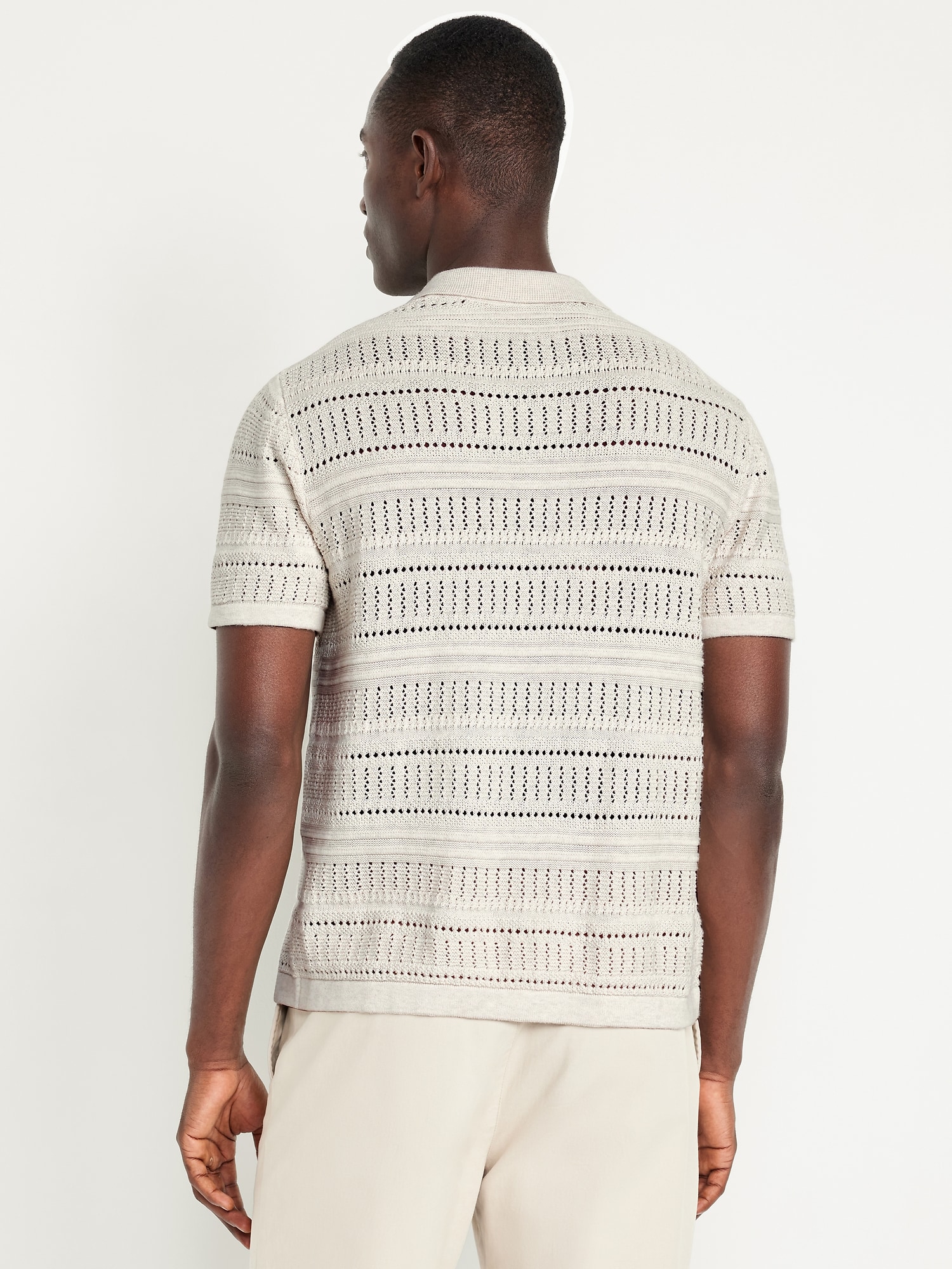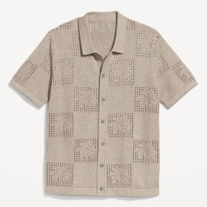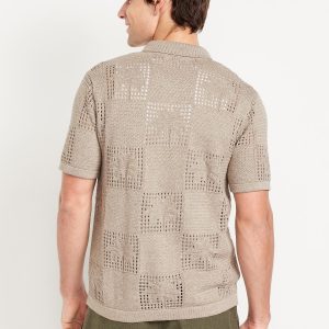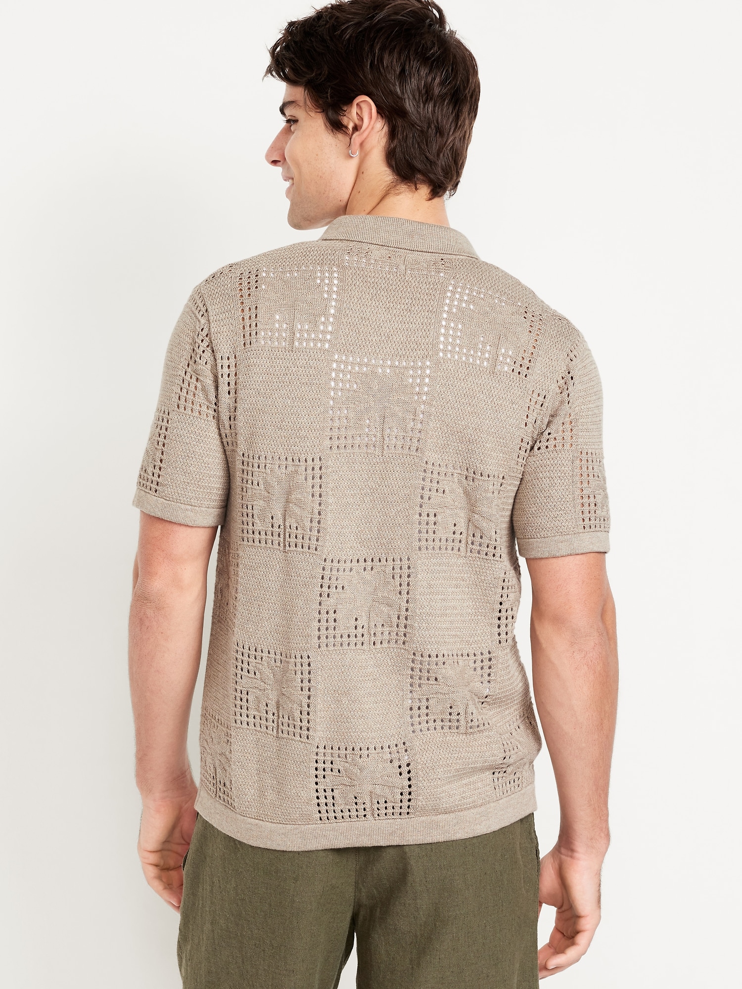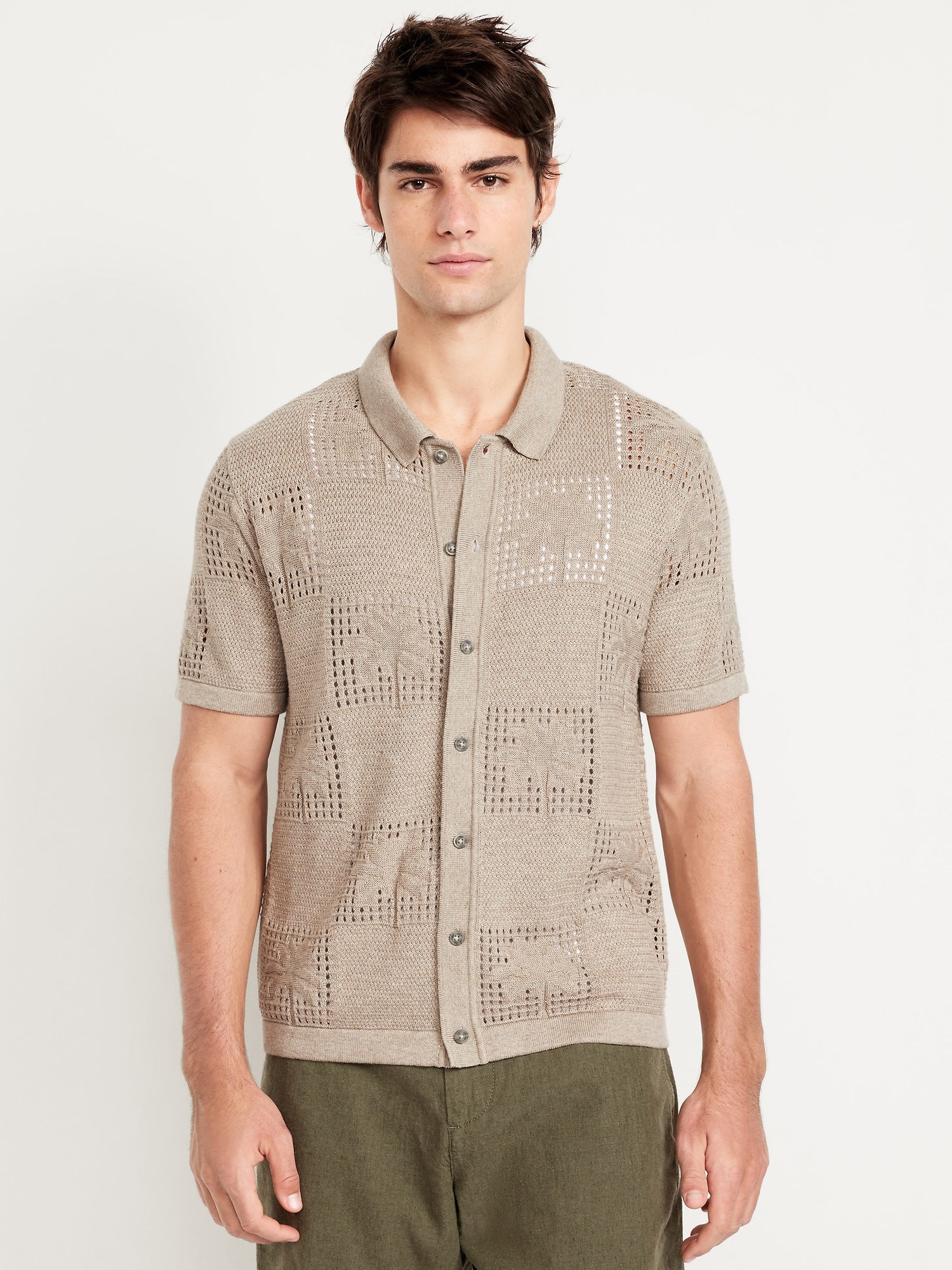 Open-Stitch Sweater Shirt: spread collar, short sleeves, full-button front, textured patterns vary, #762317