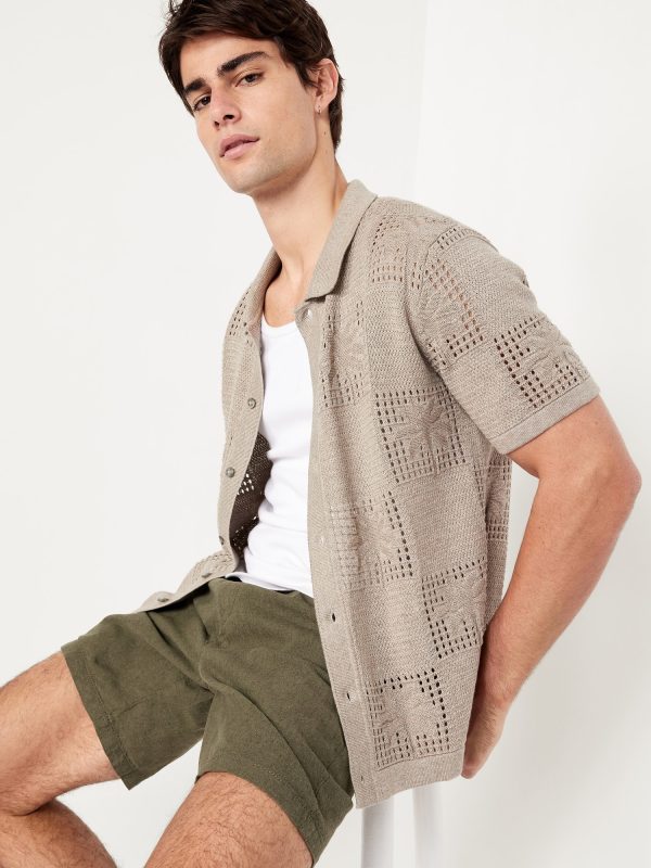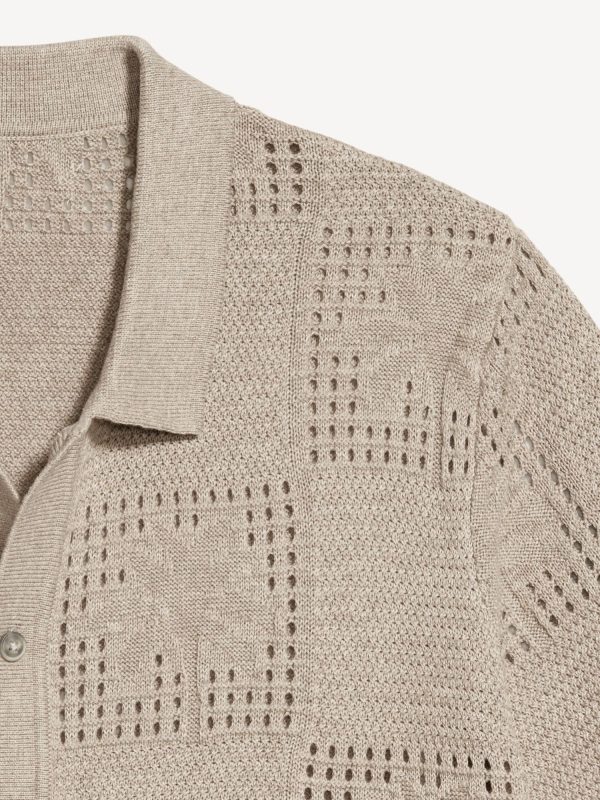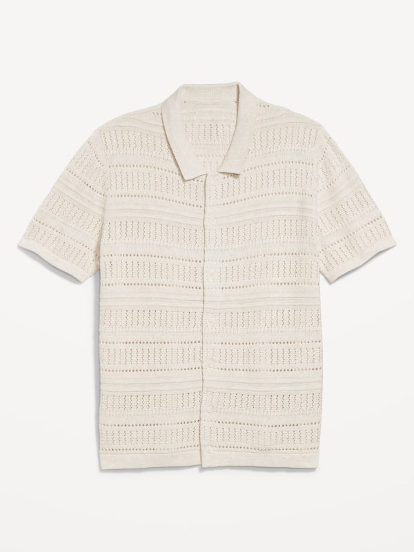 Open-Stitch Sweater Shirt: spread collar, short sleeves, full-button front, textured patterns vary, #762317