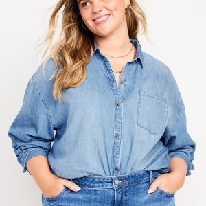 Oversized Button-Down Boyfriend Shirt: spread collar, long sleeves with buttoned cuffs, full-button front, patch chest pocket, curved hem, vertical stripes, #798437