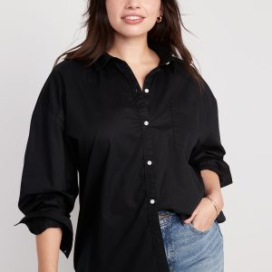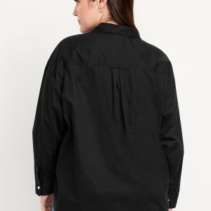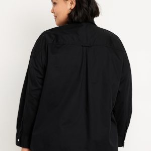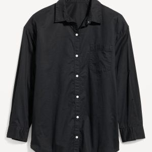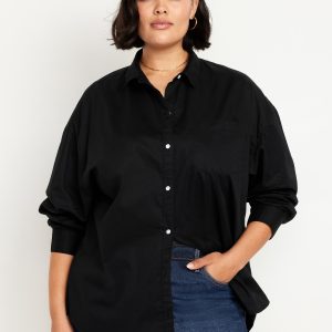 Oversized Button-Down Boyfriend Shirt: spread collar, long sleeves with buttoned cuffs, full-button front, patch chest pocket, curved hem, vertical stripes, #798437