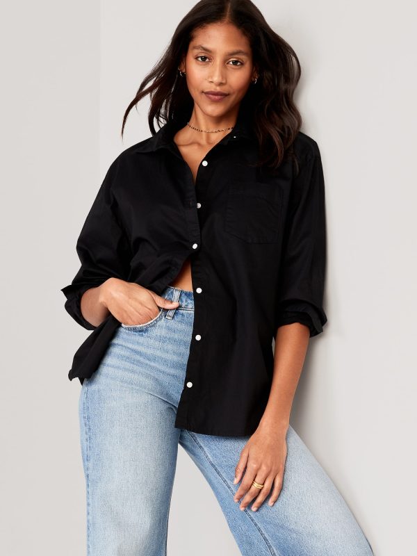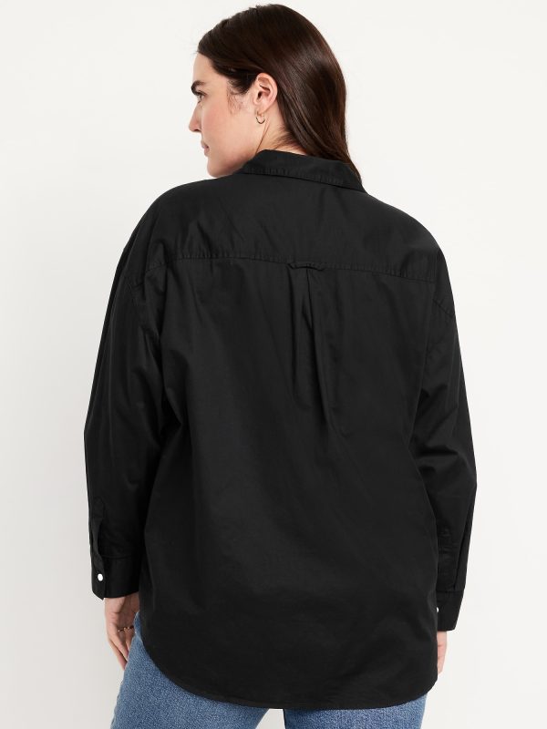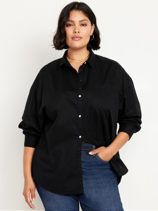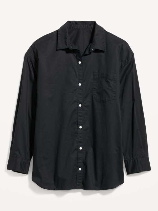 Oversized Button-Down Boyfriend Shirt: spread collar, long sleeves with buttoned cuffs, full-button front, patch chest pocket, curved hem, vertical stripes, #798437