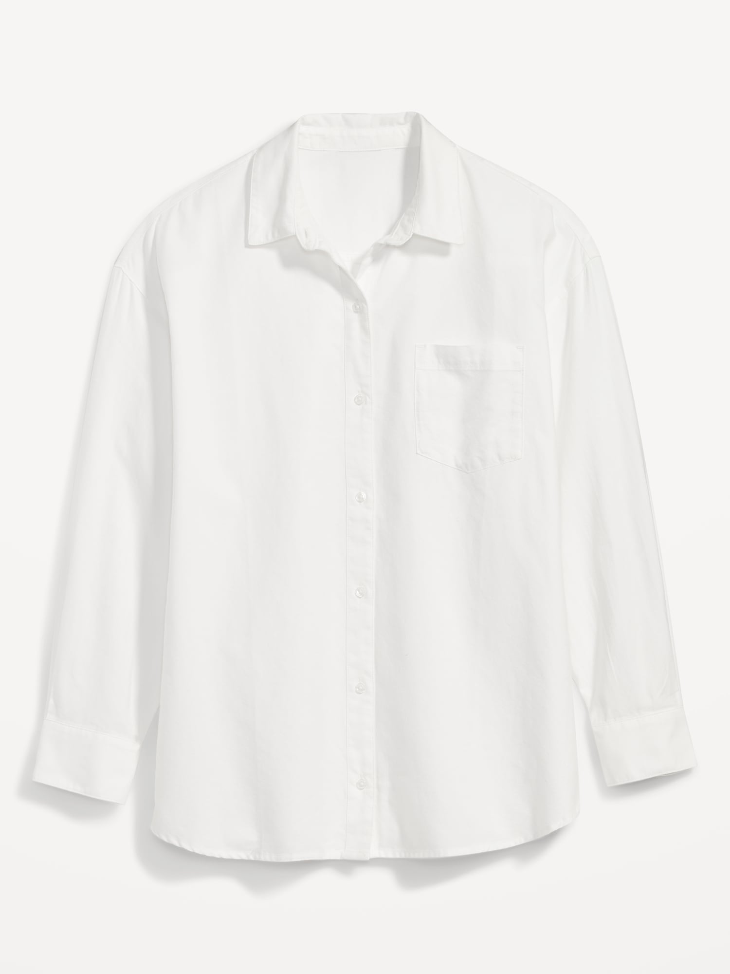 Oversized Button-Down Boyfriend Shirt: spread collar, long sleeves with buttoned cuffs, full-button front, patch chest pocket, curved hem, vertical stripes, #798437