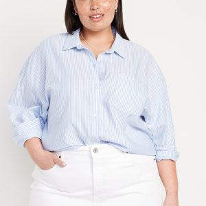 Oversized Button-Down Boyfriend Shirt: spread collar, long sleeves with buttoned cuffs, full-button front, patch chest pocket, curved hem, vertical stripes, #798437