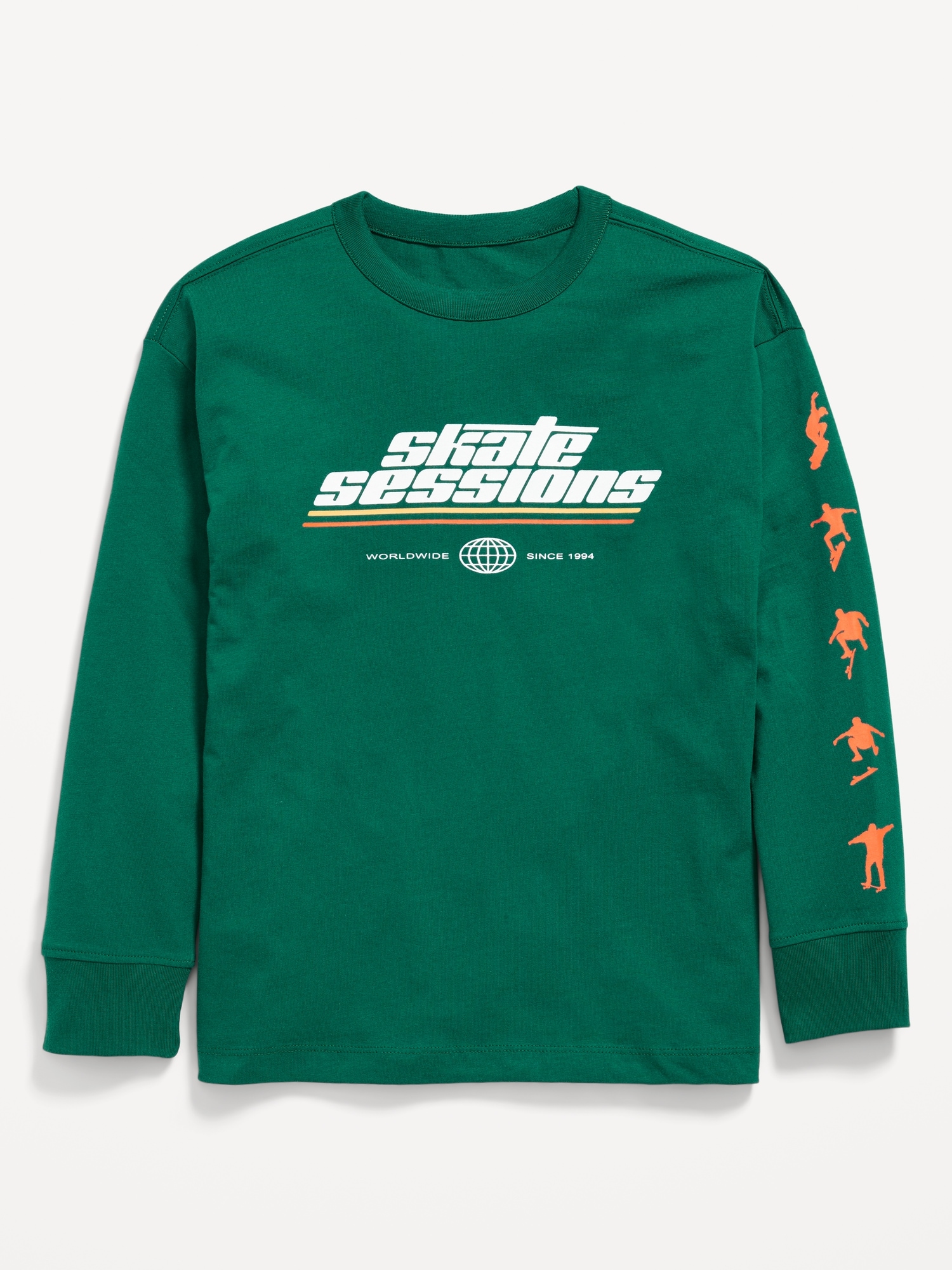 Oversized Long-Sleeve Graphic T-Shirt for Boys: crew neck, long sleeves, drop shoulders, graphic at front, #750309