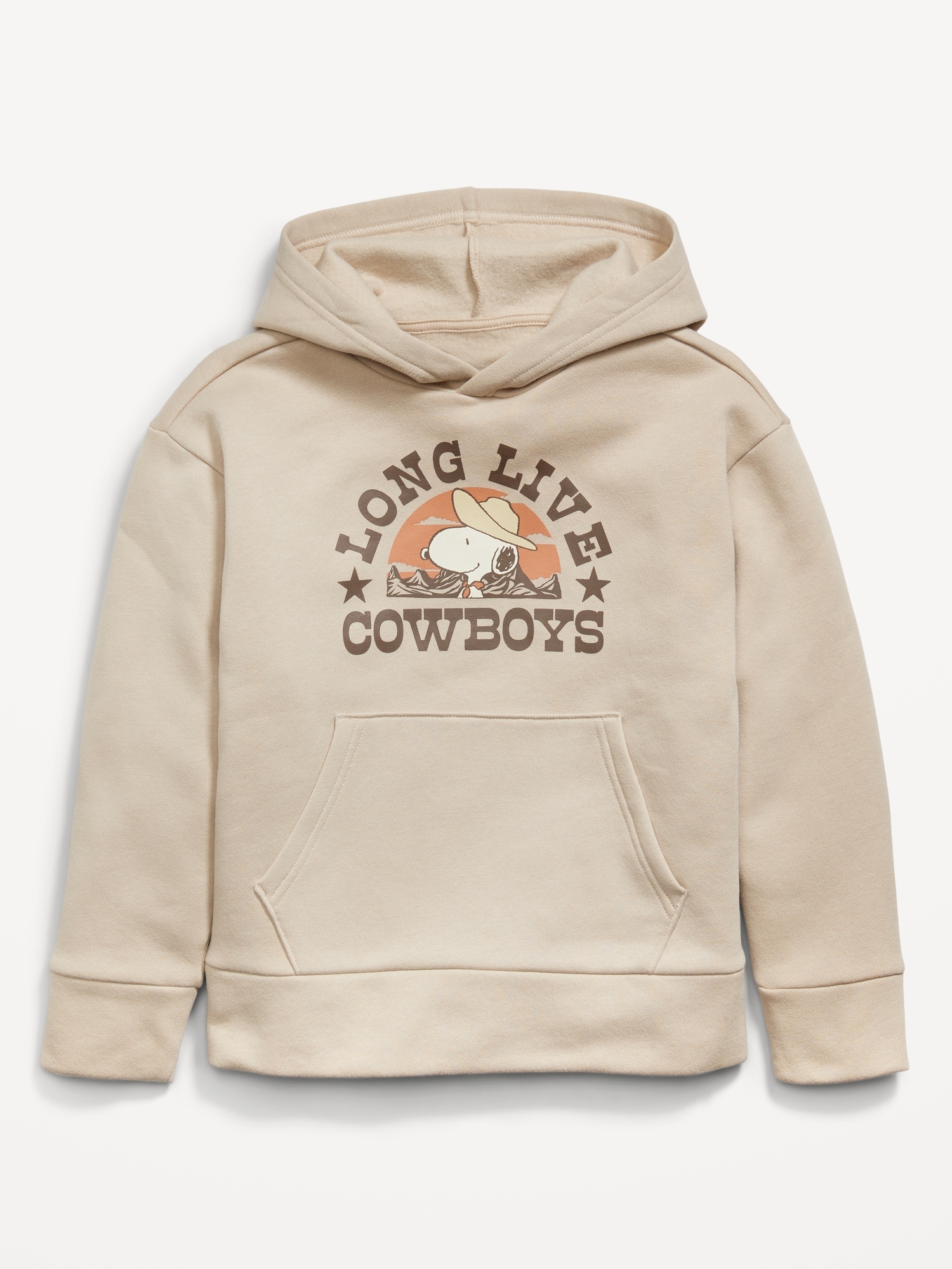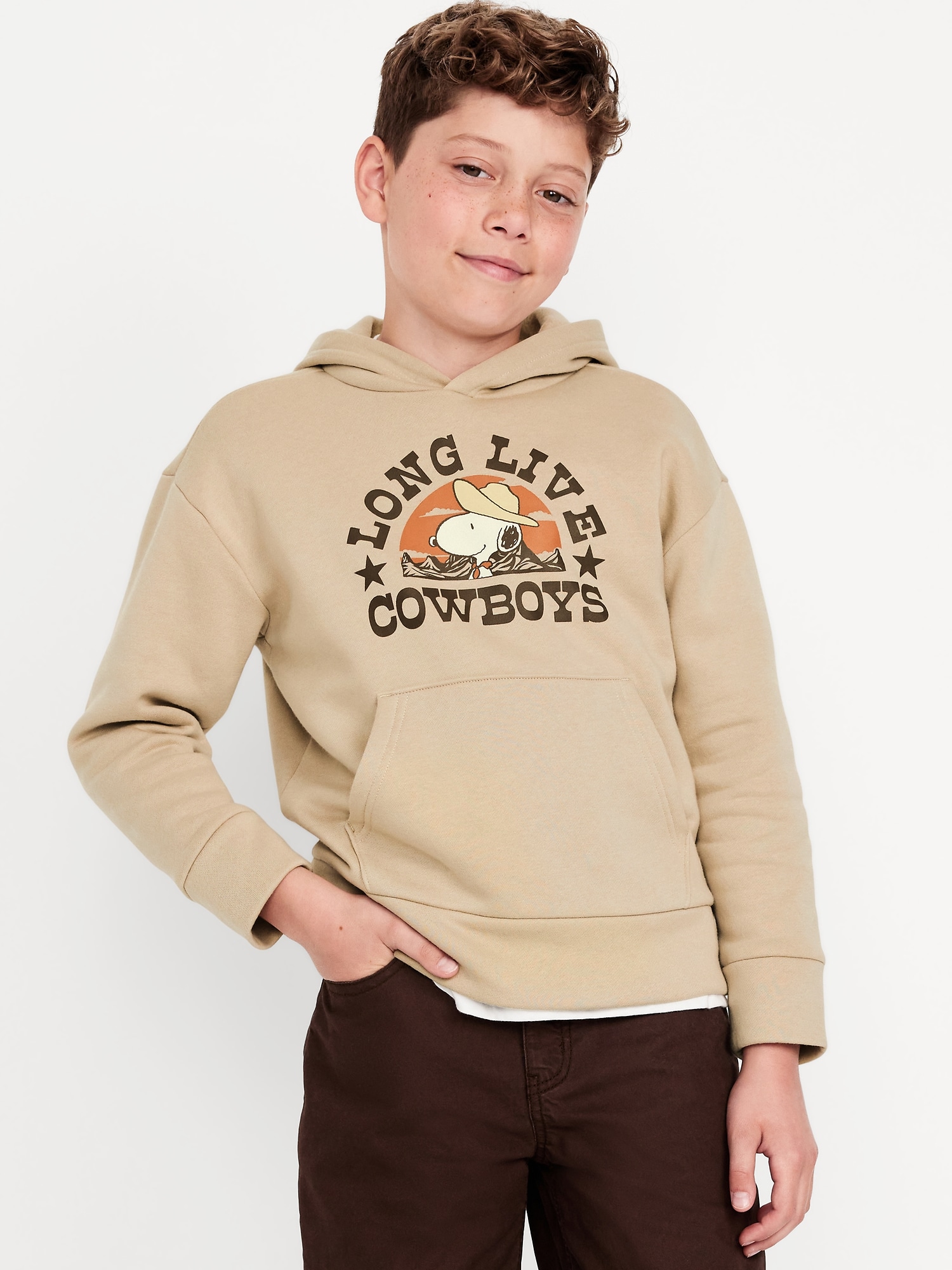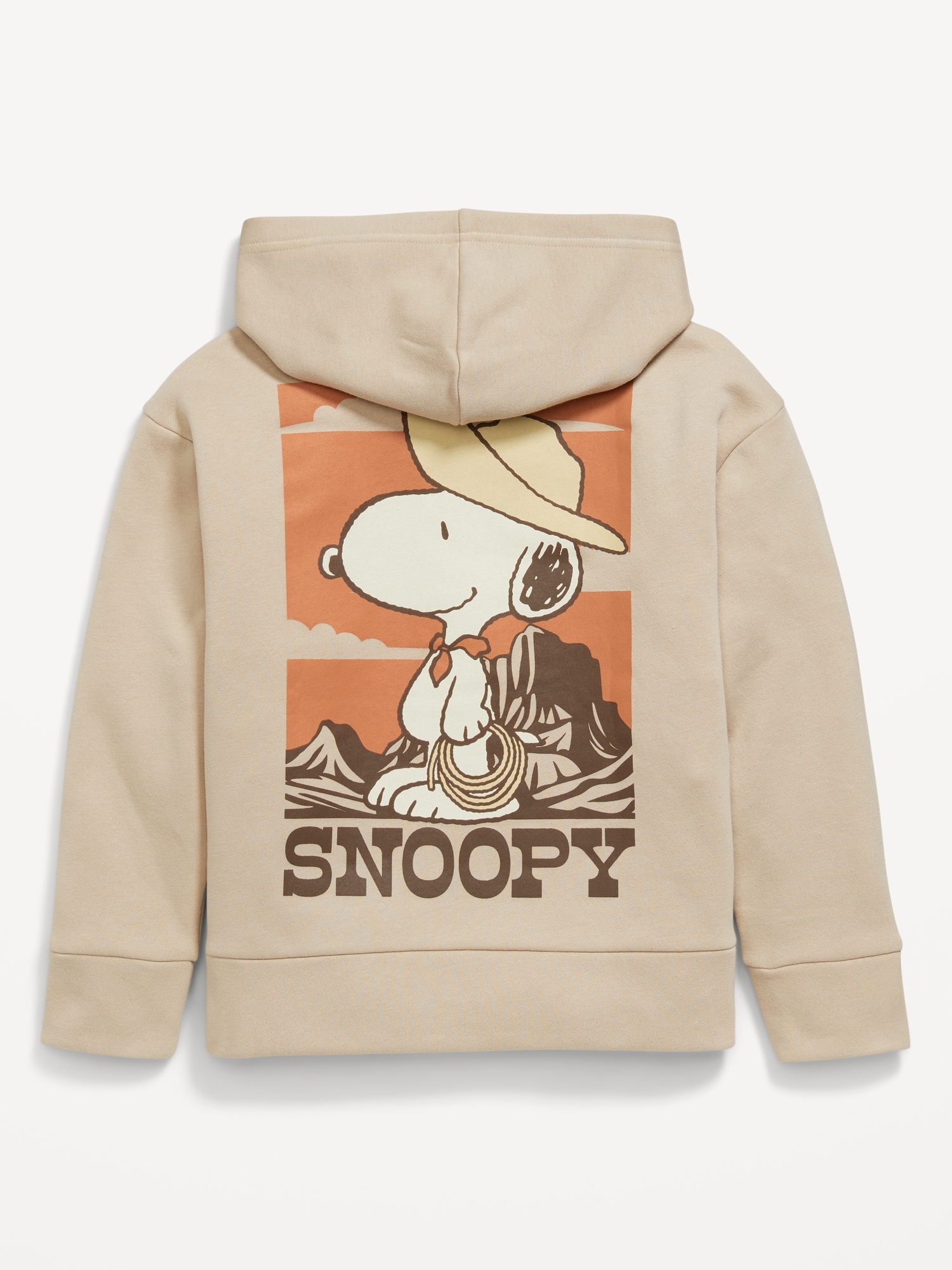 Peanuts™ Snoopy Gender-Neutral Graphic Pullover Hoodie for Kids: built-in hood, long sleeves, small-scale licensed graphic at front, large-scale licensed graphic, hand-warming pockets, banded hem, © 2025 Peanuts Worldwide LLC, #761742