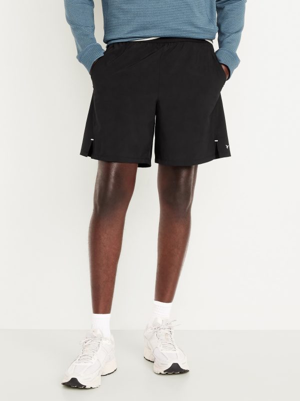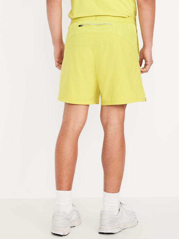 Performance Vent Run Shorts — 7-inch inseam: elastic-drawstring waistband, hidden back pocket at waist, diagonal hip pockets, vented sides, built-in briefs, breathable, quick dry, four-way stretch, #693436