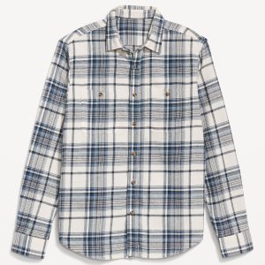 Plaid Flannel Pocket Shirt: spread collar, long sleeves with buttoned cuffs, button-patch chest pockets, full-button front, rounded hem, #801296