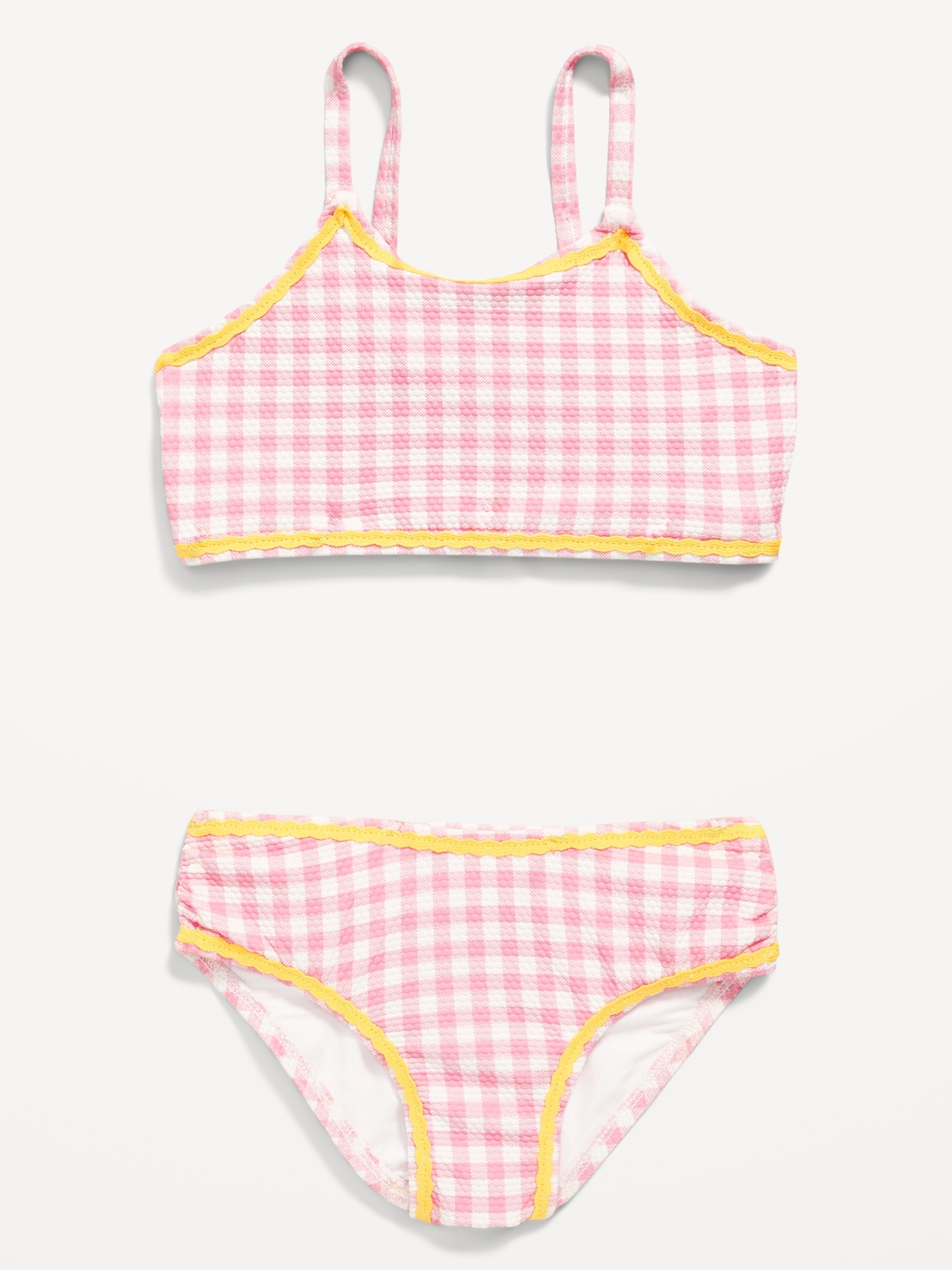 Printed Bikini Swim Set for Toddler & Baby: rounded neckline, thin straps, decorative crossover tie at back, matching bikini swim bottoms, all-over print, contrasting zig zag trim, #762436