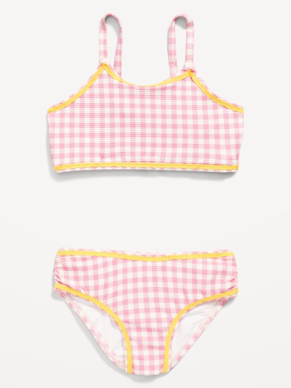 Printed Bikini Swim Set for Toddler & Baby: rounded neckline, thin straps, decorative crossover tie at back, matching bikini swim bottoms, all-over print, contrasting zig zag trim, #762436
