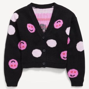 Printed Button-Front Cardigan Sweater for Girls: v neck, long sleeves, drop shoulders, buttoned placket, ribbed hem, all-over print, #766958