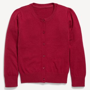 Printed Button-Front Cardigan Sweater for Girls: v neck, long sleeves, drop shoulders, buttoned placket, ribbed hem, all-over print, #766958