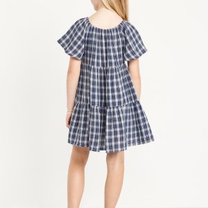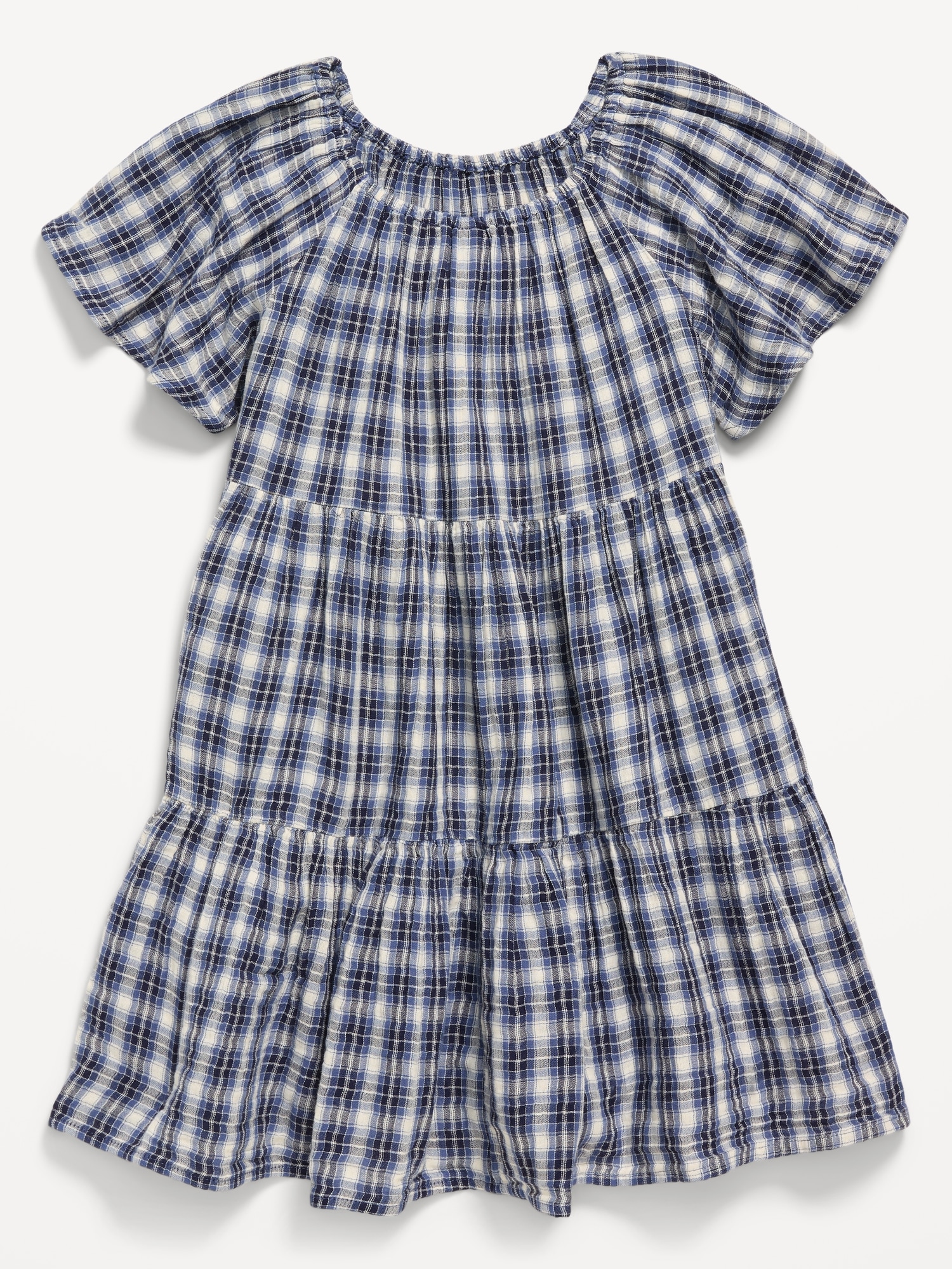 Printed Flutter-Sleeve Double-Weave Tiered Swing Dress for Girls: square cinched neckline, short flutter sleeves, tiered skirt, all-over print, #806067