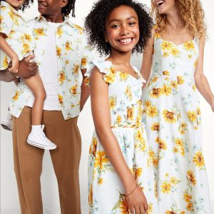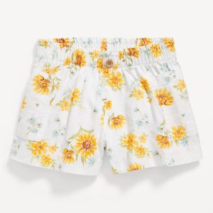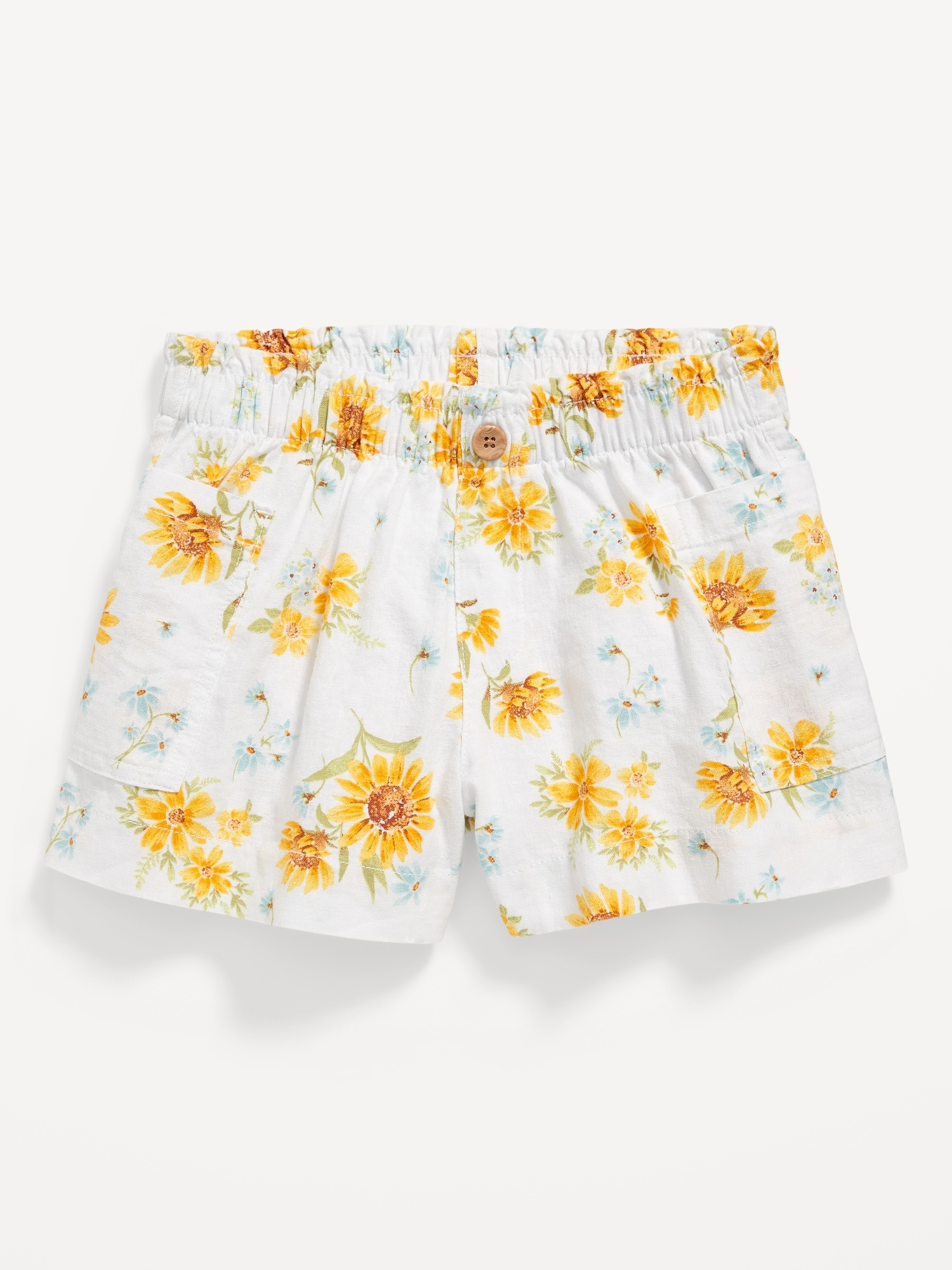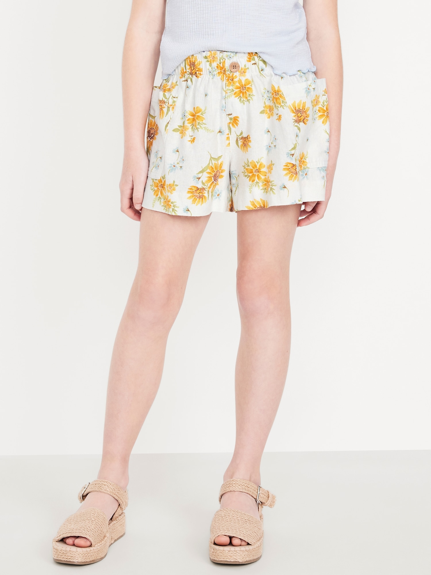 Printed Linen-Blend Utility Shorts for Girls: elasticized waistband, decorative button front, utility patch pockets at each side, all-over print, #767129