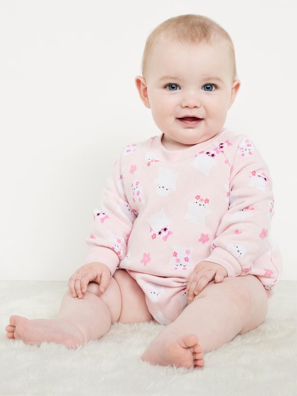 Printed Long-Sleeve Fleece Bodysuit for Baby: crew neck, long raglan sleeves, elasticized bubble leg openings, hidden snaps along inseam, all-over print, #802253