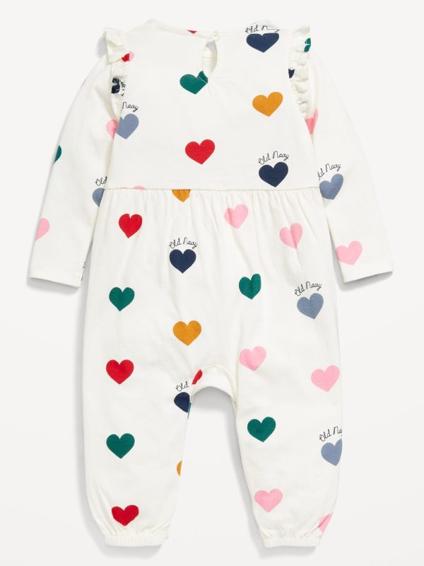 Printed Long-Sleeve Logo-Graphic Jumpsuit for Baby: round neckline, long sleeves, keyhole cutout at nape, ruffle trim along shoulders, seamed waist, hidden snaps at inseam, all-over logo graphic, available exclusively online and at old navy outlet stores., #806244