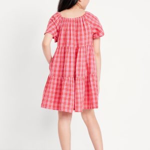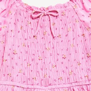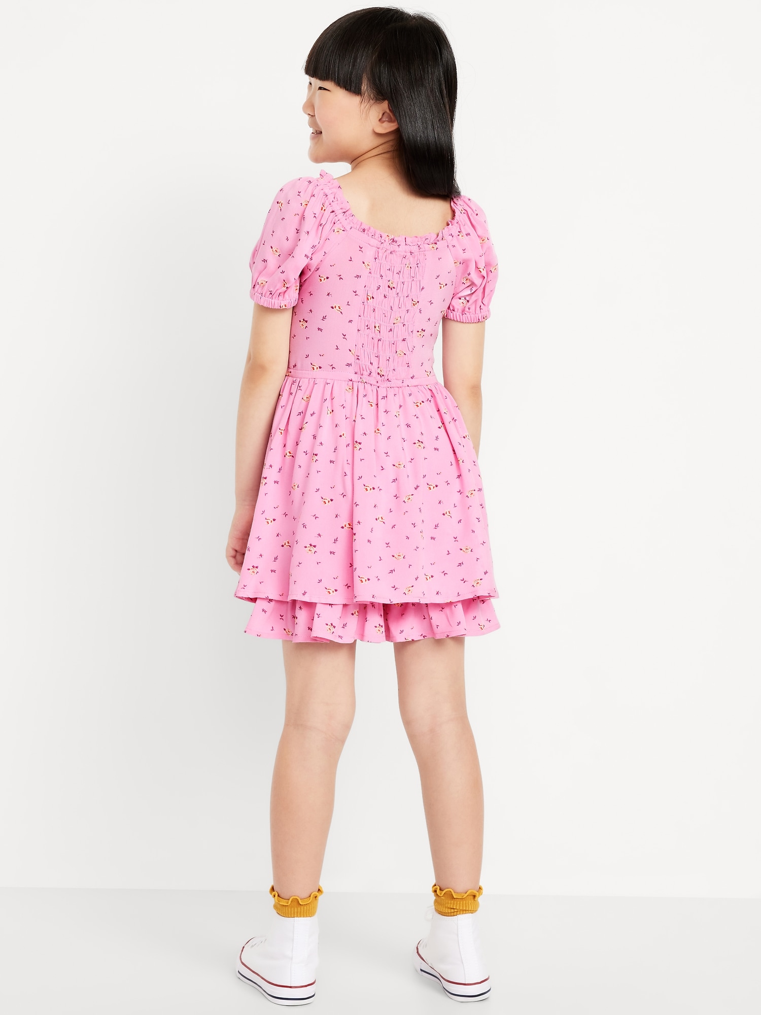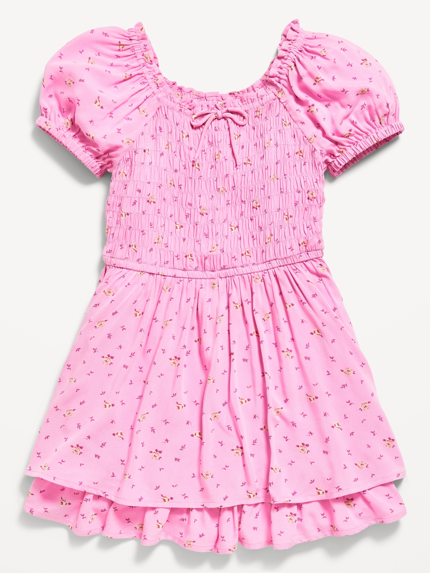 Printed Puff-Sleeve Smocked Dress for Girls: ruffled square neckline, short puff sleeves, smocked back, seamed waist, flowy skirt, built-in shorts, layered look at bottom, all-over print, #766638
