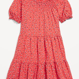 Printed Short-Sleeve Swing Dress for Girls: round smocked neckline, short puff sleeves, tiered skirt, on-seam pockets, #806141