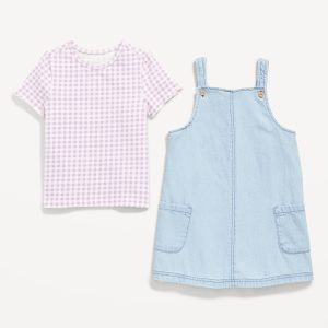 Printed Short-Sleeve T-Shirt and Jean Dress Set for Toddler Girls: crew neck, short sleeves, all-over print, coordinating dress, square neckline, scoop back, adjustable shoulder straps, side patch pockets, #766996