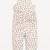 Printed Sleeveless Jumpsuit for Baby: square neckline, thin shoulder straps, diagonal on-seam pockets, hidden snaps along inseam, cinched leg cuffs, embroidered pattern, #802255