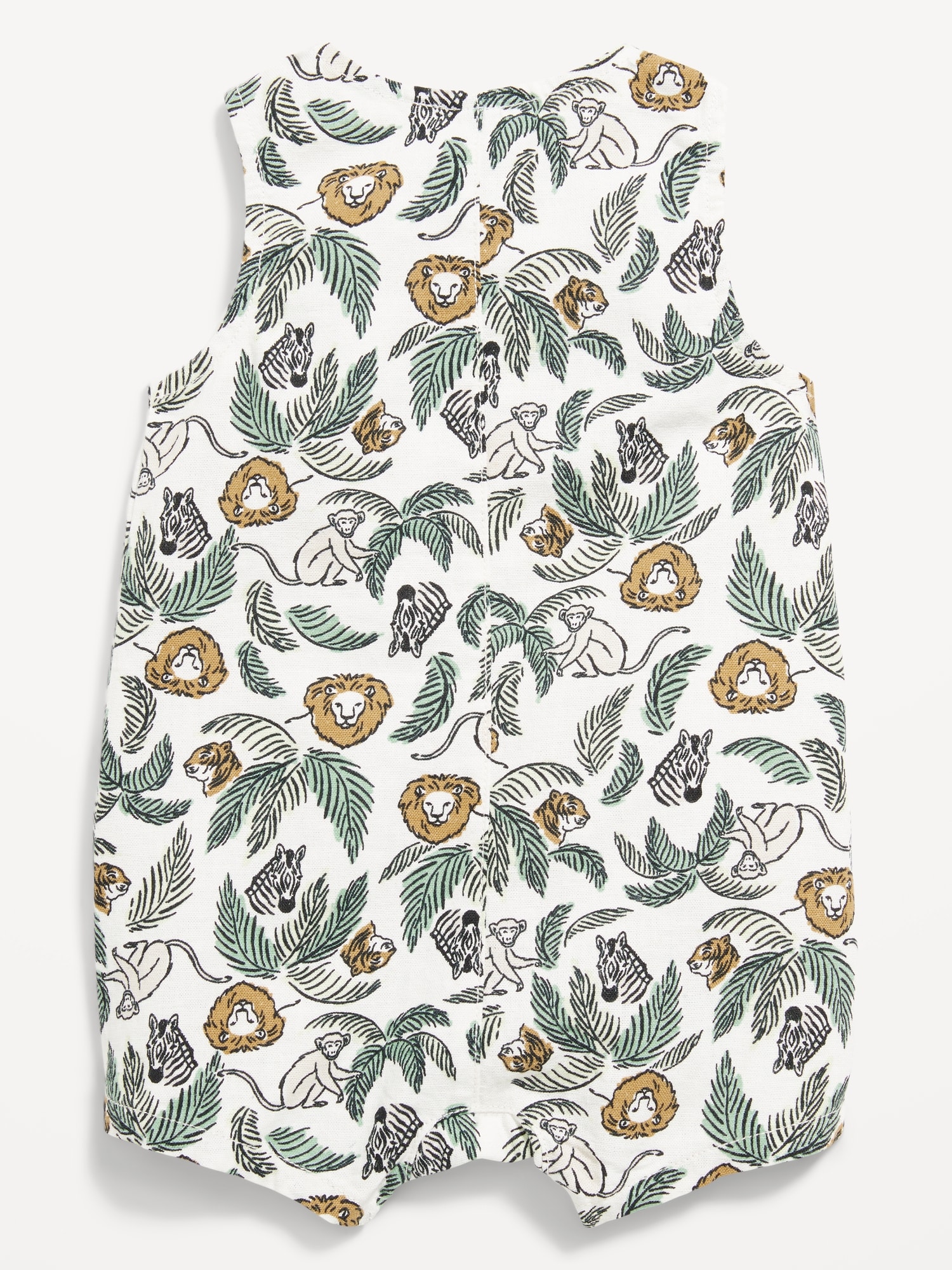Printed Sleeveless Linen-Blend Henley One-Piece Romper for Baby: rounded neckline, sleeveless, three-button henley, patch pockets at front, hidden snaps along inseam, all-over print, #762083