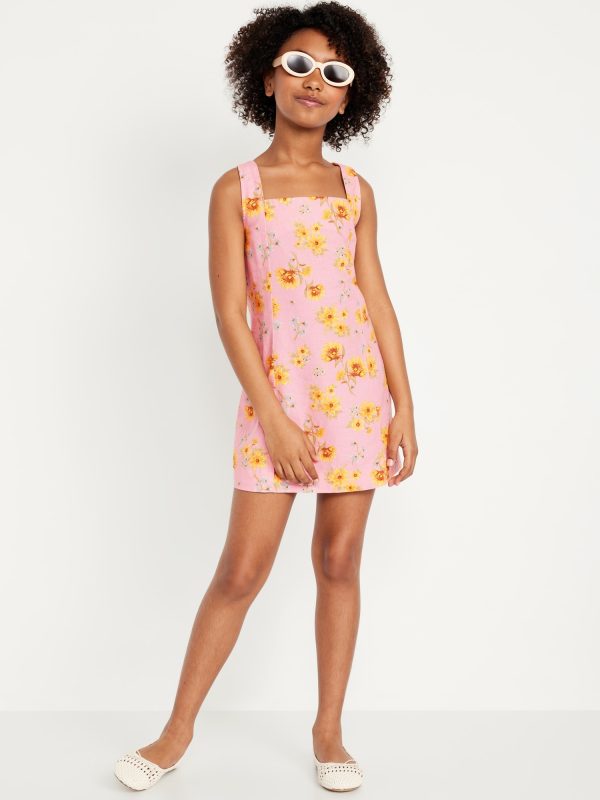 Printed Sleeveless Linen-Blend Shift Dress for Girls: square neck, wide shoulder straps, smocked back, #759487