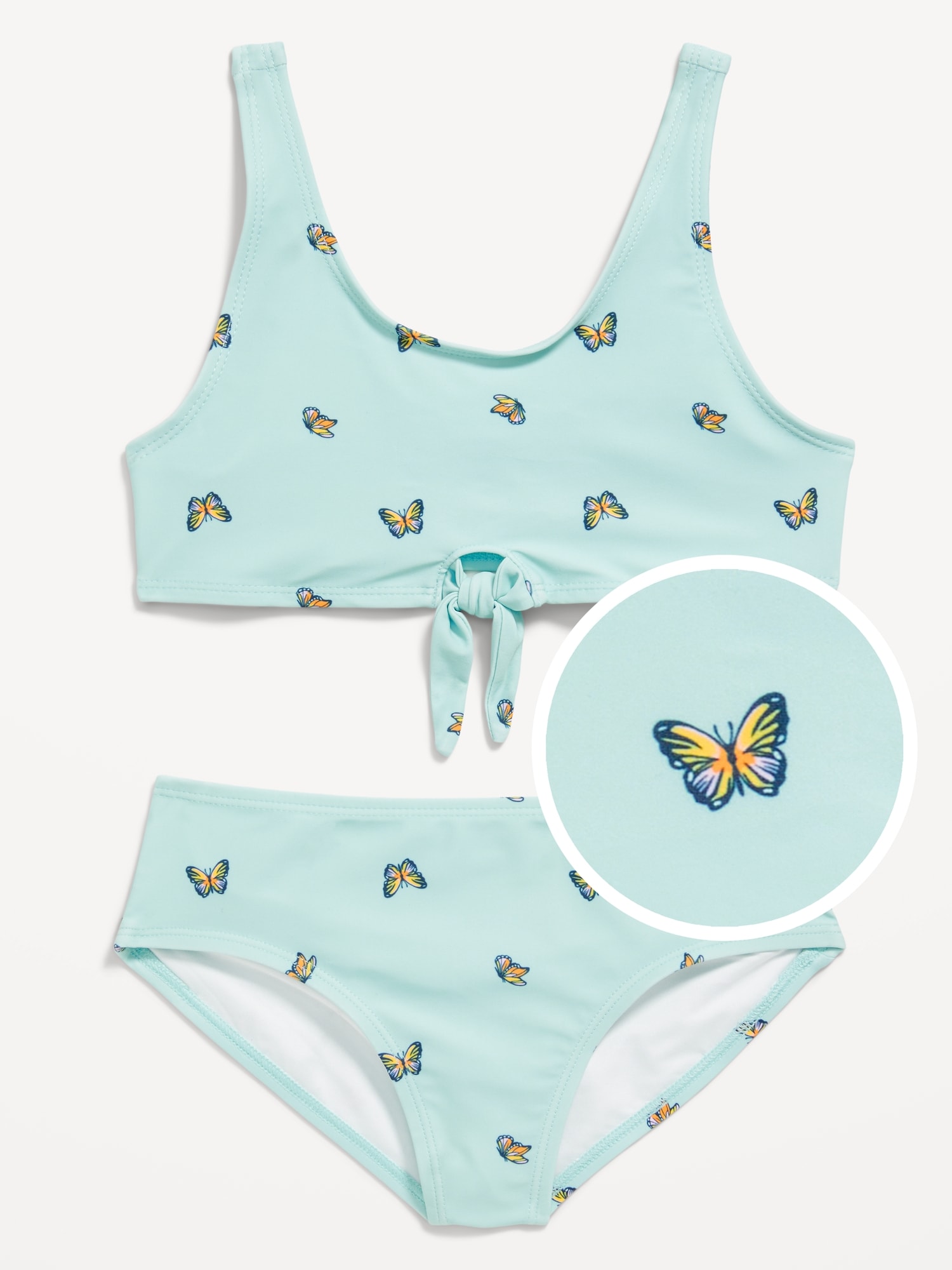 Printed Tie-Knot Bikini Swim Set for Girls: scoop neck, wide shoulder straps, tie-knot at hem, matching bikini swim bottoms, elasticized waist and leg openings, all-over print, #660307