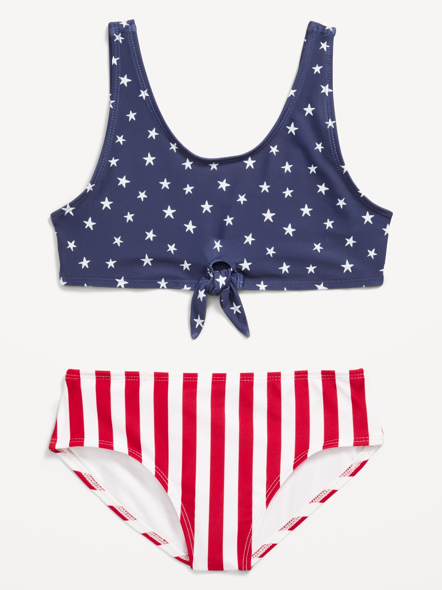 Printed Tie-Knot Bikini Swim Set for Girls: scoop neck, wide shoulder straps, tie-knot at hem, matching bikini swim bottoms, elasticized waist and leg openings, all-over print, #660307