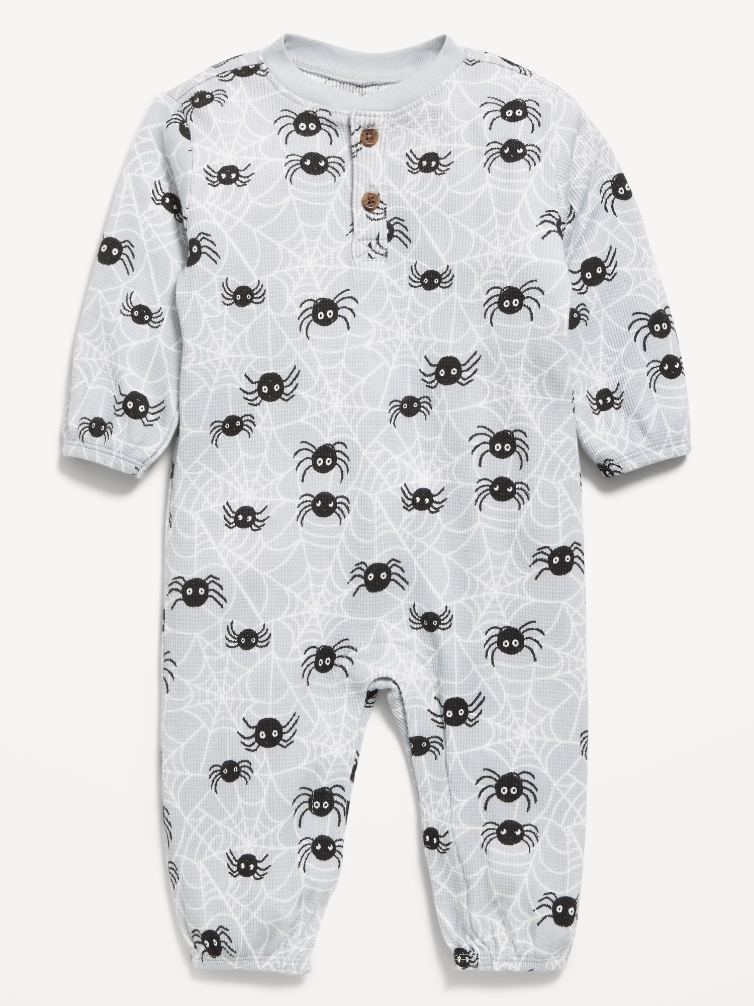 Printed Waffle-Knit Henley One-Piece for Baby: crew neck, two-button henley placket, long sleeves, hidden snaps along inseam, #804450