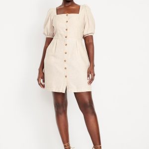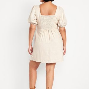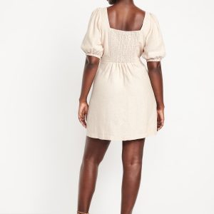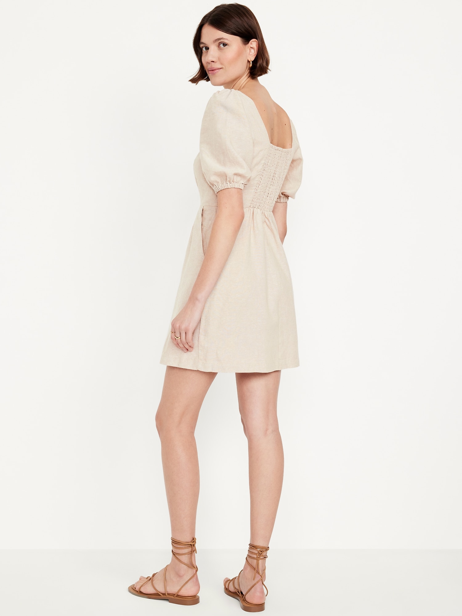 Puff-Sleeve Linen-Blend Mini Dress: square neck, short puff sleeves, elastic cuffs, full-button front, smocked back, diagonal hip pockets, seamed waist, #705712