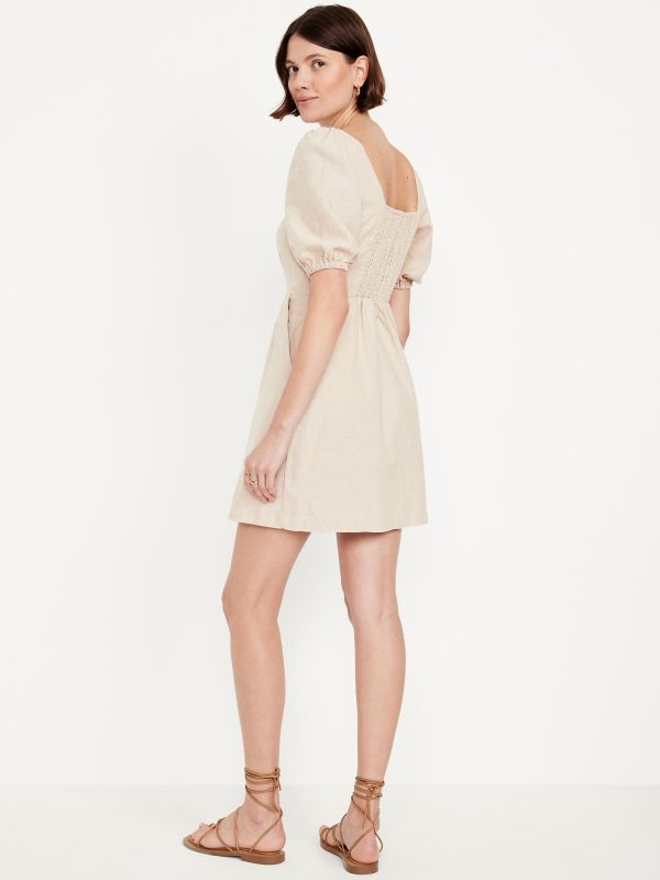 Puff-Sleeve Linen-Blend Mini Dress: square neck, short puff sleeves, elastic cuffs, full-button front, smocked back, diagonal hip pockets, seamed waist, #705712