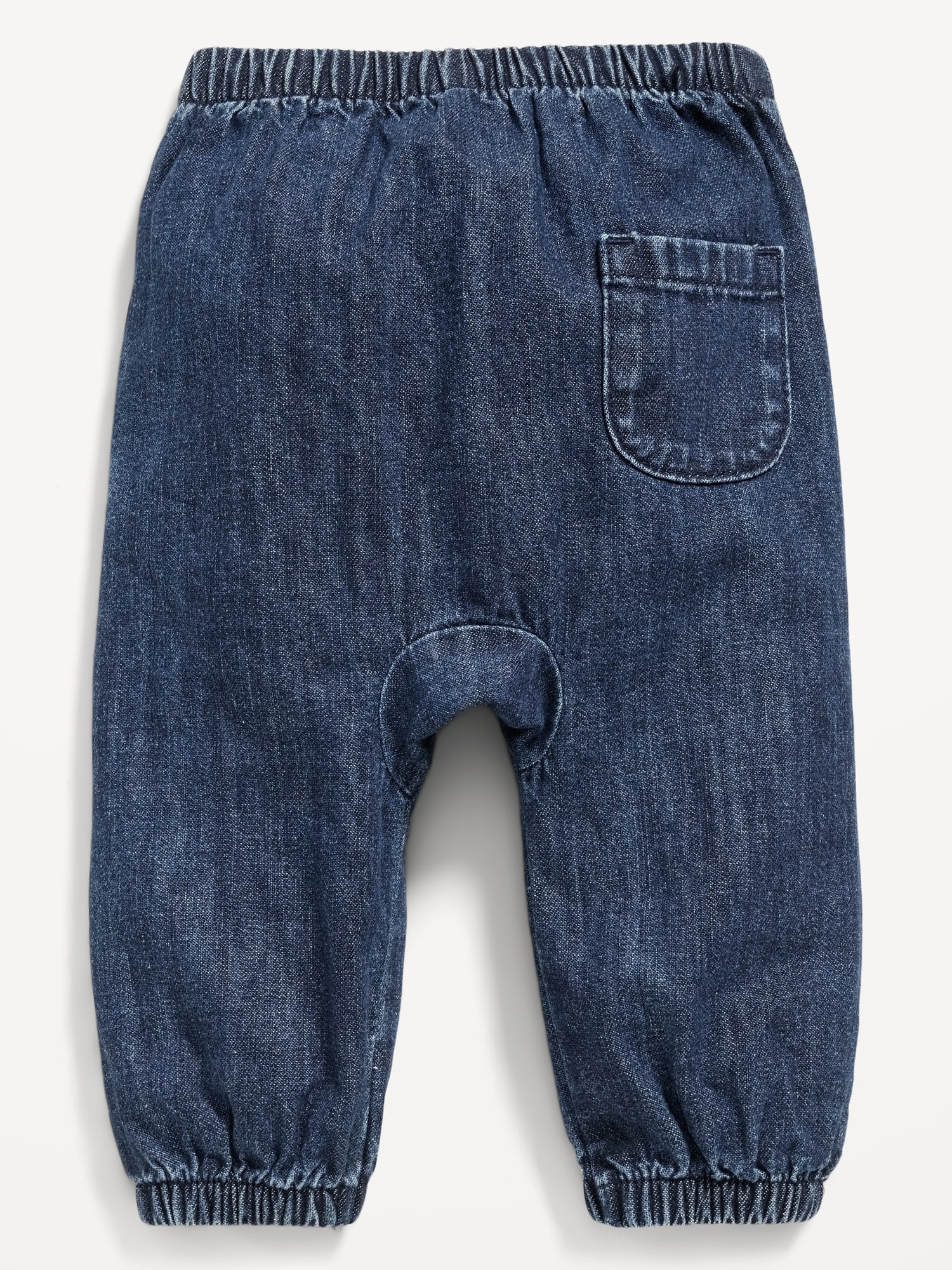 Pull-On Chambray Pants for Baby: elasticized waistband, patch pocket at back, knee patches, elasticized leg cuffs, easy pull-on style, #802715