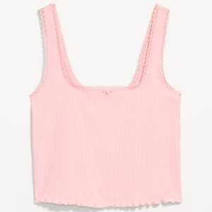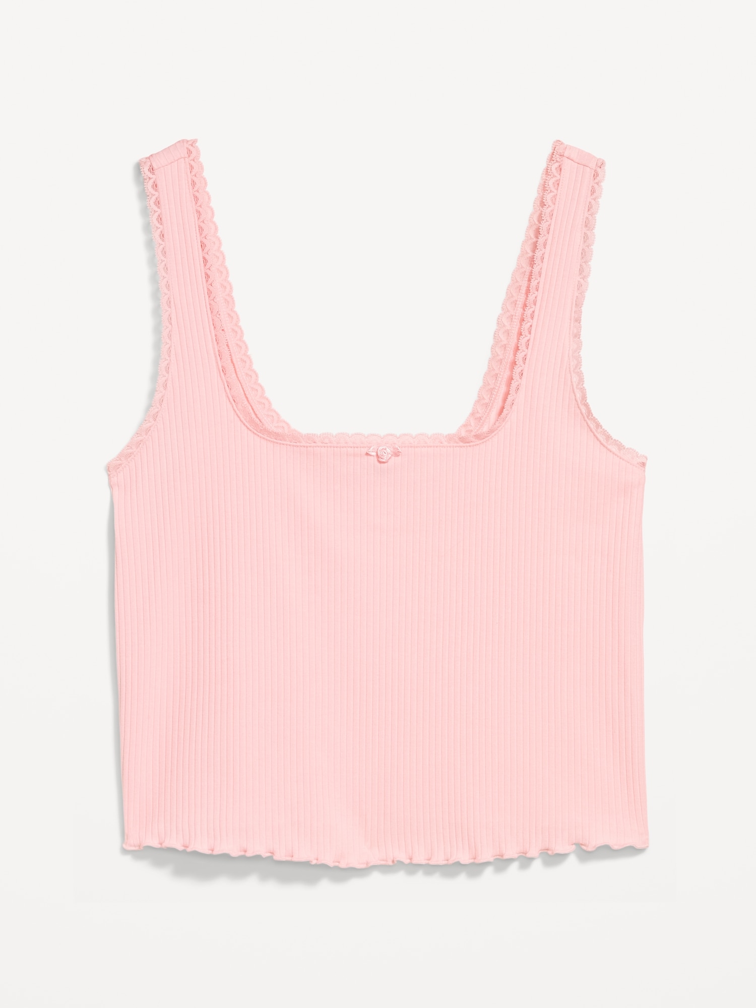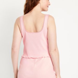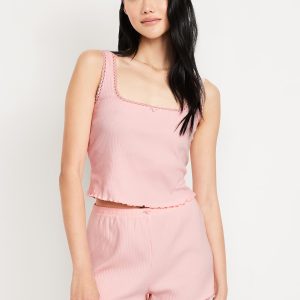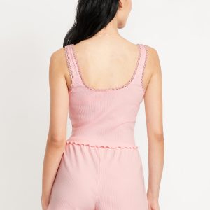 Rib Cropped Pajama Tank Top: ruffle-trim scoop neck, wide straps, lettuce-edge hem, #707474